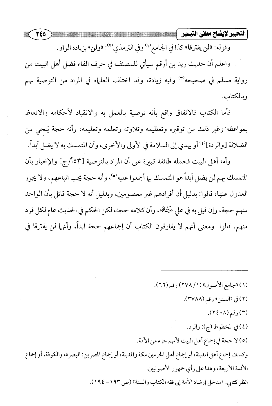 وأما أهل البيت فحمله طائفة كبيرة على أن المراد بالتوصية [53 أ/ ج] والإخبار بأن المتمسك بهم لن يضل أبداً هو المتمسك بما أجمعوا عليه (¬5)، وأنه حجة يجب اتباعهم، ولا يجوز العدول عنها، قالوا: بدليل أن أفرادهم غير معصومين، وبدليل أنه لا حجة قائل بأن الواحد منهم حجة، وإن قيل به في علي - عليه السلام -، وأن كلامه حجة، لكن الحكم في الحديث عام لكل فرد منهم. قالوا: ومعنى أنهم لا يفارقون الكتاب أن إجماعهم حجة أبداً، وأنهما لن يفترقا في