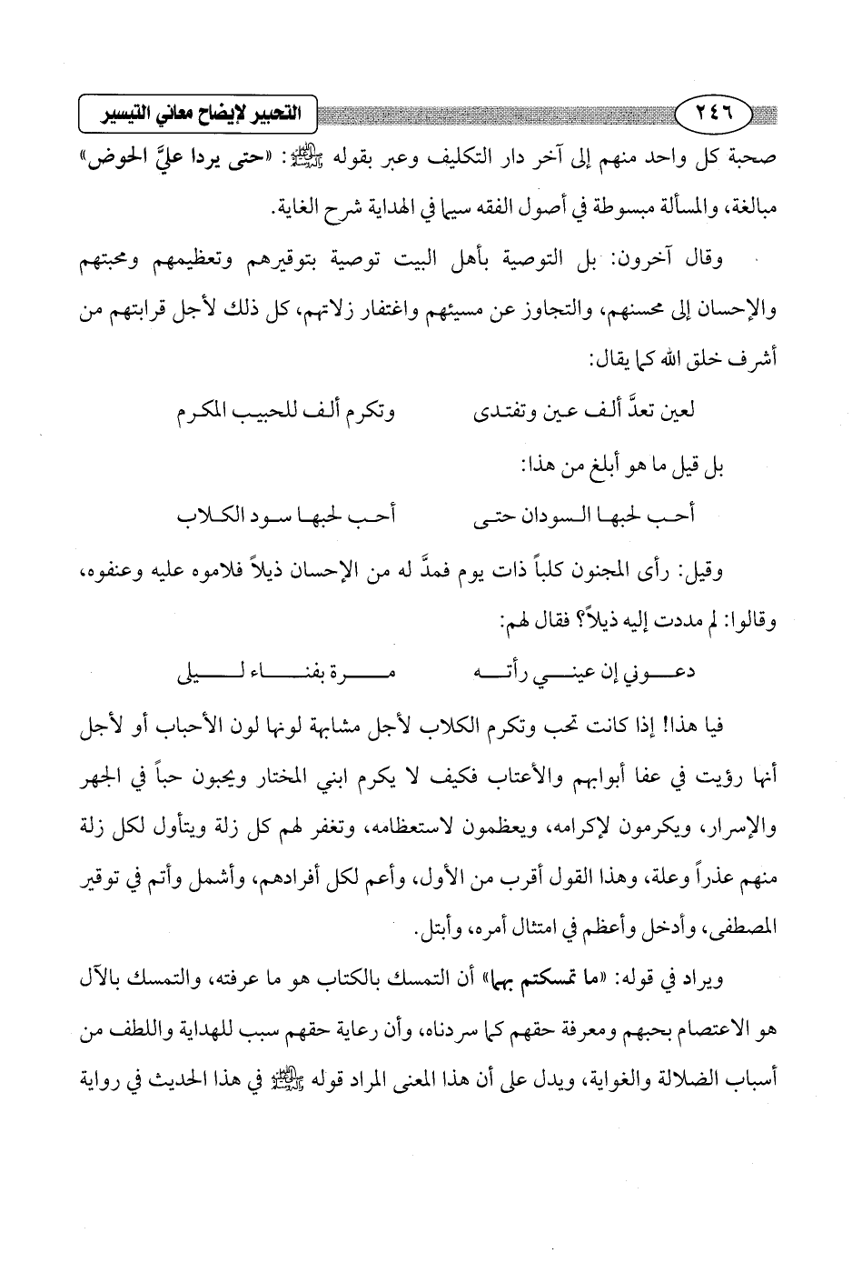 فيا هذا! إذا كانت تحب وتكرم الكلاب لأجل مشابهة لونها لون الأحباب أو لأجل أنها رؤيت في عفا أبوابهم والأعتاب فكيف لا يكرم ابني المختار ويحبون حباً في الجهر والإسرار، ويكرمون لإكرامه، ويعظمون لاستعظامه، وتغفر لهم كل زلة ويتأول لكل زلة منهم عذراً وعلة، وهذا القول أقرب من الأول، وأعم لكل أفرادهم، وأشمل وأتم في توقير المصطفى، وأدخل وأعظم في امتثال أمره، وأبتل.