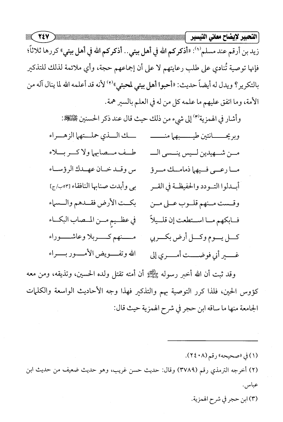 زيد بن أرقم عند مسلم (¬1): "أذكركم الله في أهل بيتي .. أذكركم الله في أهل بيتي" كررها ثلاثاً؛ فإنها توصية تُنادي على طلب رعايتهم لا على أن إجماعهم حجة، وأي ملائمة لذلك للتذكير بالتكرير؟ ويدل له أيضاً حديث: "أحبوا أهل بيتي لمحبتي" (¬2) لأنه قد أعلمه الله لما ينال آله من الأمة، وما اتفق عليهم ما علمه كل من له في العلم بالسير همة.