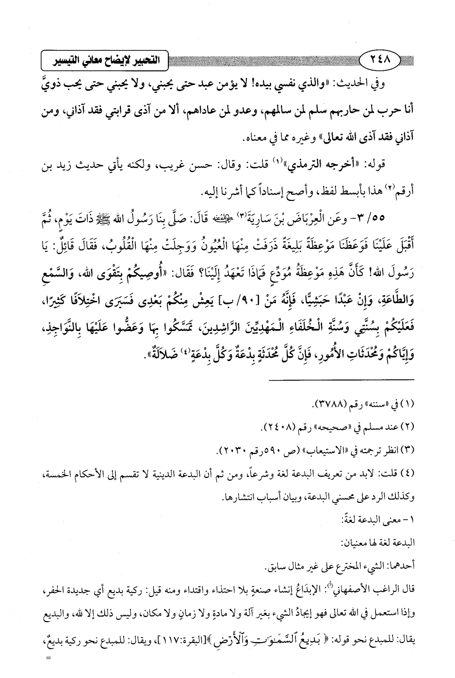 (¬4) قلت: لا بد من تعريف البدعة لغة وشرعاً، ومن ثم أن البدعة الدينية لا تقسم إلى الأحكام الخمسة، وكذلك الرد على محسني البدعة، وبيان أسباب انتشارها.