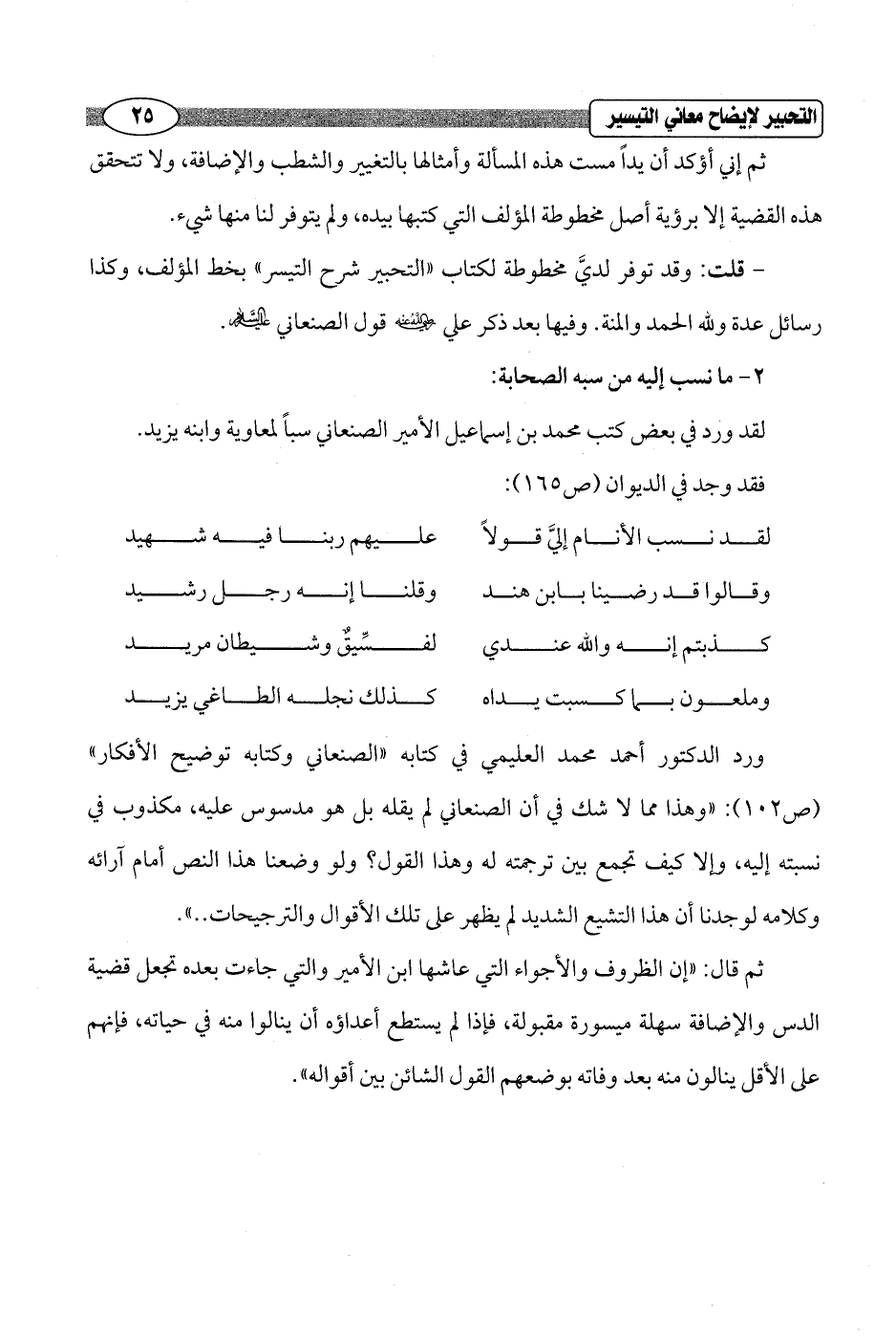 - قلت: وقد توفر لديَّ مخطوطة لكتاب "التحبير شرح التيسر" بخط المؤلف، وكذا رسائل عدة ولله الحمد والمنة. وفيها بعد ذكر علي - رضي الله عنه - قول الصنعاني - عليه السلام -.