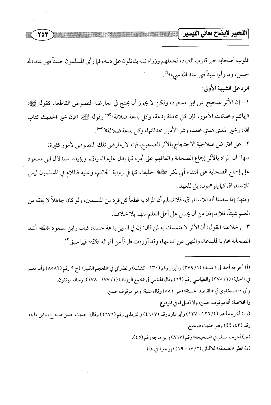 1 - إن الأثر صحيح عن ابن مسعود، ولكن لا يجوز أن يحتج في معارضة النصوص القاطعة كقوله - صلى الله عليه وسلم -: "إياكم ومحدثات الأمور، فإن كل محدثة بدعة، وكل بدعة ضلالة" (ب) وقوله - صلى الله عليه وسلم -: "فإن خير الحديث كتاب الله، وخير الهدي هدي محمَّد، وشر الأمور محدثاتها، وكل بدعة ضلالة" (جـ).
