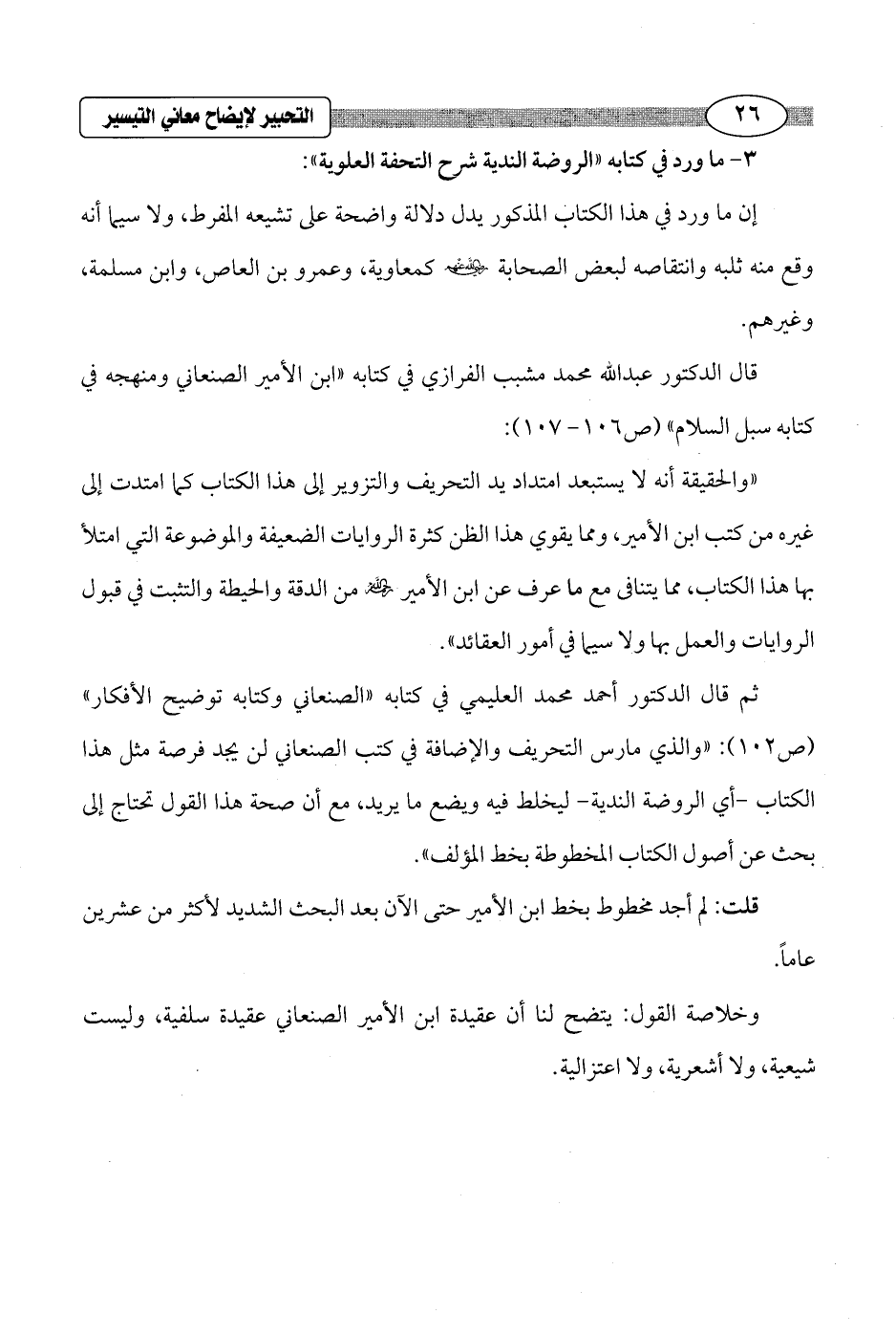 "والحقيقة أنه لا يستبعد امتداد يد التحريف والتزوير إلى هذا الكتاب كما امتدت إلى غيره من كتب ابن الأمير، ومما يقوي هذا الظن كثرة الروايات الضعيفة والموضوعة التي امتلأ بها هذا الكتاب، مما يتنافى مع ما عرف عن ابن الأمير - رحمه الله - من الدقة والحيطة والتثبت في قبول الروايات والعمل بها ولا سيما في أمور العقائد".