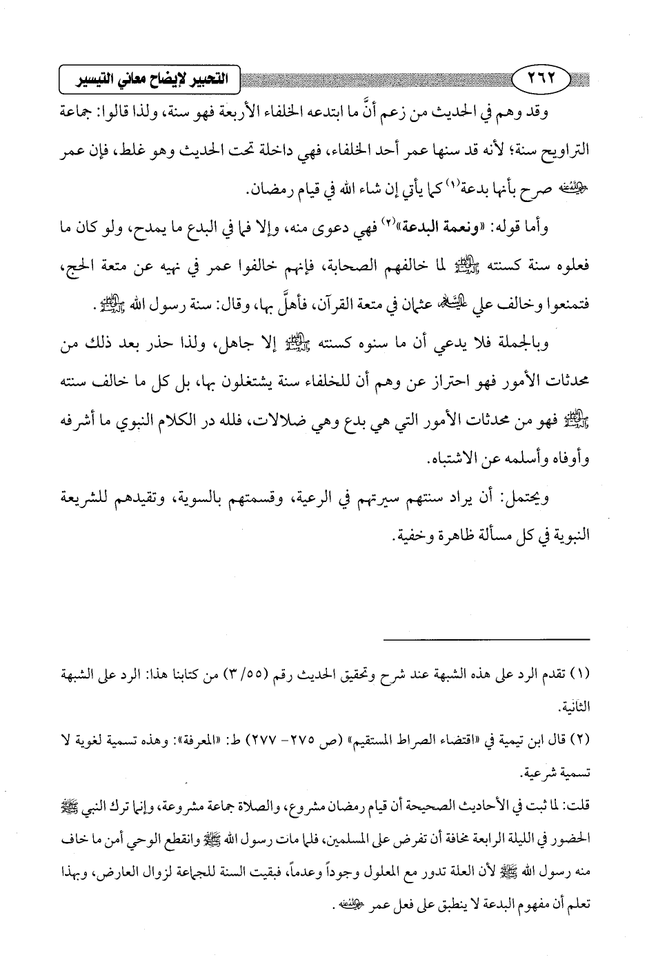 قلت: لما ثبت في الأحاديث الصحيحة أن قيام رمضان مشروع، والصلاة جماعة مشروعة وإنما ترك النبي - صلى الله عليه وسلم - الحضور في الليلة الرابعة مخافة أن تفرض على المسلمين، فلما مات رسول الله - صلى الله عليه وسلم - وانقطع الوحي أمن ما خاف منه رسول الله - صلى الله عليه وسلم - لأن العلة تدور مع المعلول وجوداً وعدماً، فبقيت السنة للجماعة لزوال العارض، وبهذا تعلم أن مفهوم البدعة لا ينطبق على فعل عمر - رضي الله عنه -.