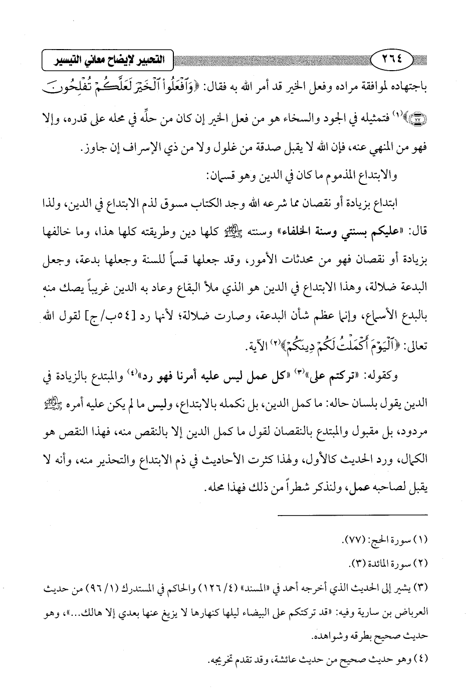 (¬3) يشير إلى الحديث الذي أخرجه أحمد في "المسند" (4/ 126) والحاكم في المستدرك (1/ 96) من حديث العرباض بن سارية وفيه: "قد تركتكم على البيضاء ليلها كنهارها لا يزيغ عنها بعدي إلا هالك ... "، وهو حديث صحيح بطرقه وشواهده.