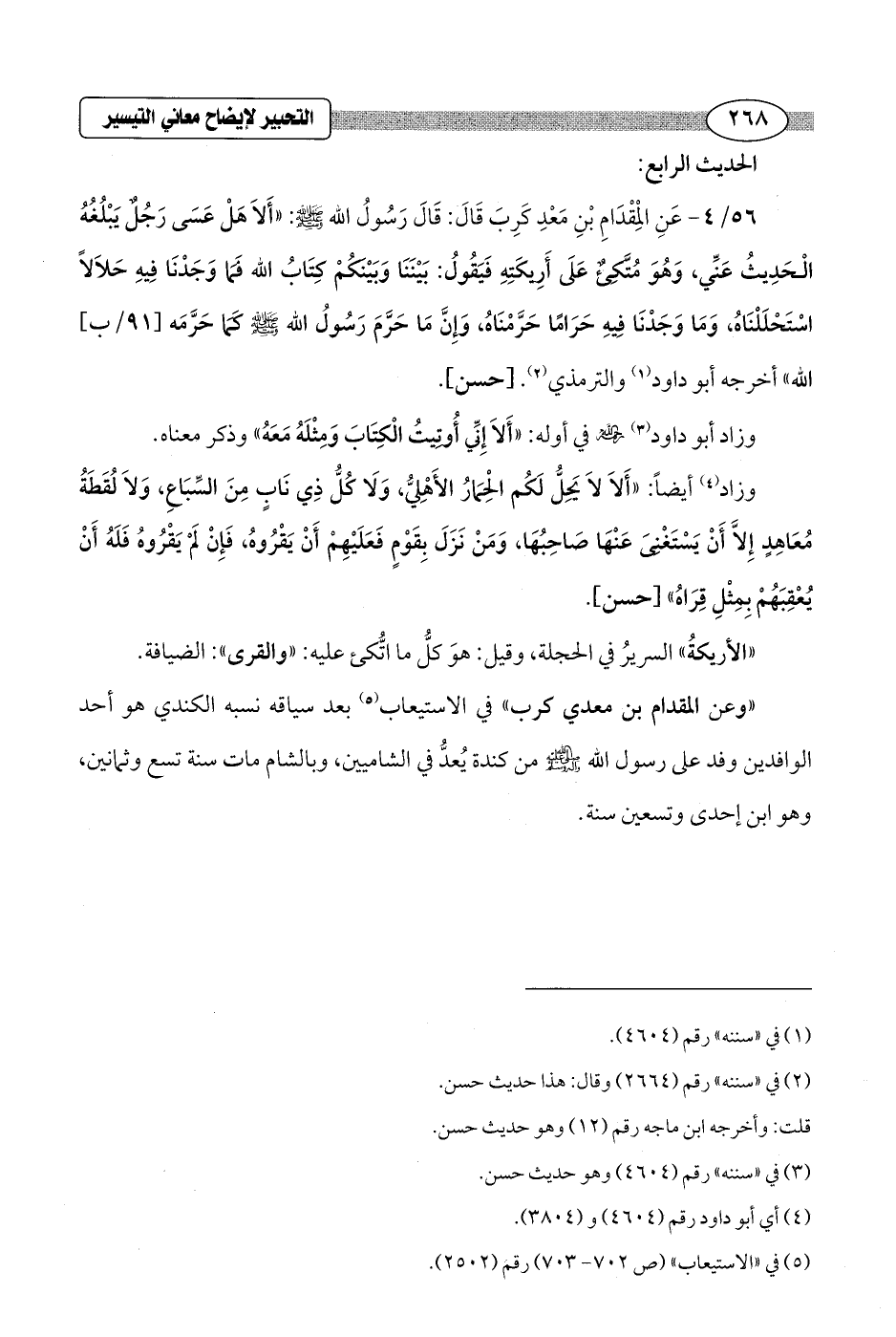 56/ 4 - عَنِ الْمِقْدَامِ بْنِ مَعْدِ كَرِبَ قَالَ: قَالَ رَسُولُ الله - صلى الله عليه وسلم -: "أَلاَ هَلْ عَسَى رَجُل يَبْلُغُهُ الْحَدِيثُ عَنِّي، وَهُوَ مُتَّكِئٌ عَلَى أَرِيكَتِهِ فَيَقُولُ: بَيْنَنَا وَبَيْنكُمْ كِتَابُ الله فَمَا وَجَدْنَا فِيهِ حَلاَلاً اسْتَحْلَلْنَاهُ، وَمَا وَجَدْنَا فِيهِ حَرَامًا حَرَّمْنَاه, وَإِنَّ مَا حَرَّمَ رَسُولُ الله - صلى الله عليه وسلم - كَمَا حَرَّمَه [91/ ب] الله" أخرجه أبو داود (¬1) والترمذي (¬2). [حسن].