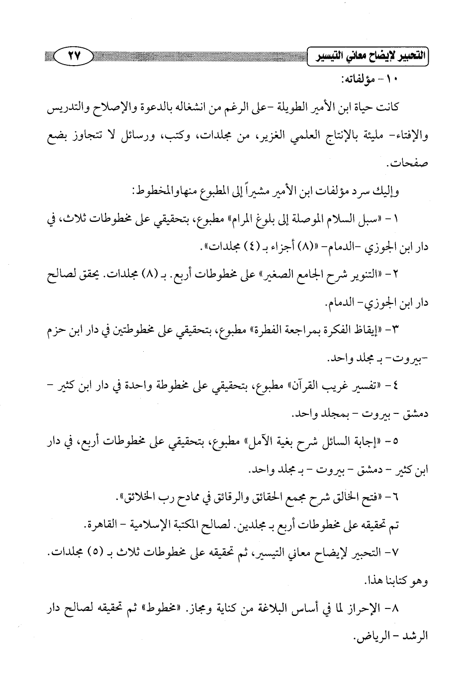 1 - "سبل السلام الموصلة إلى بلوغ المرام" مطبوع، بتحقيقي على مخطوطات ثلاث، في دار ابن الجوزي - الدمام - " (8) أجزاء بـ (4) مجلدات".