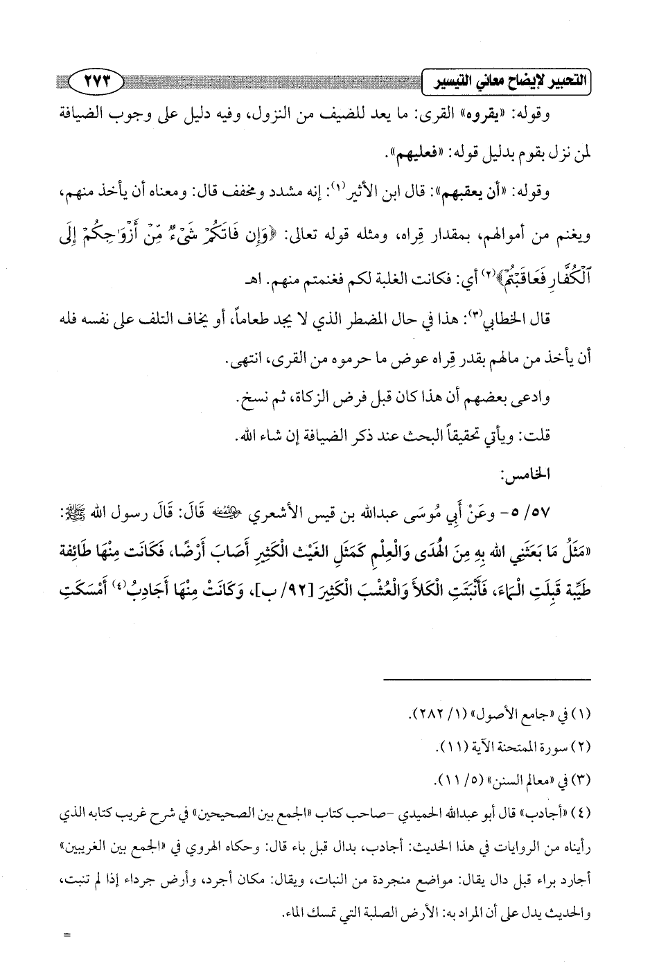 57/ 5 - وعَنْ أَبِي مُوسَى عبد الله بن قيس الأشعري - رضي الله عنه - قَالَ: قَالَ رسول الله - صلى الله عليه وسلم -: "مَثَلُ مَا بَعَثَنِي الله بِهِ مِنَ الهدَى وَالْعِلْمِ كَمَثَلِ الغَيْث الْكَثِيرِ أَصَابَ أَرْضًا، فكَانَت مِنْهَا طَائِفة طَيِّبة قَبِلَتِ الْمَاءَ، فَأَنْبَتَتِ الْكَلأَ وَالْعُشْبَ الْكَثِيرَ [92/ ب]، وَكَانَتْ مِنْهَا أَجَادِبُ (¬4) أَمْسَكَتِ