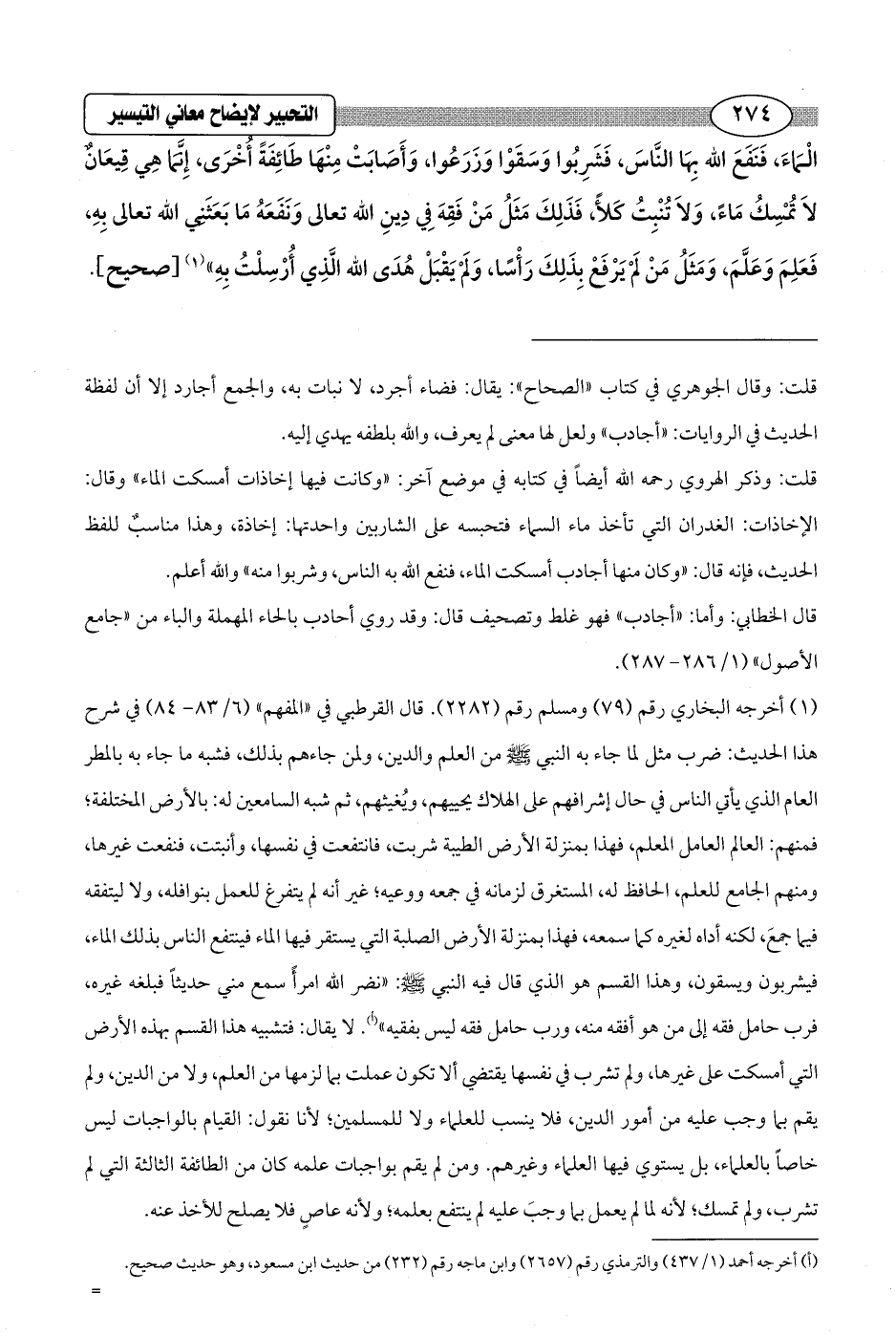 (¬1) أخرجه البخاري رقم (79) ومسلم رقم (2282). قال القرطبي في "المفهم" (6/ 83 - 84) في شرح هذا الحديث: ضرب مثل لما جاء به النبي - صلى الله عليه وسلم - من العلم والدين، ولمن جاءهم بذلك، فشبه ما جاء به بالمطر العام الذي يأتي الناس في حال إشرافهم على الهلاك يحييهم، ويُغيثهم، ثم شبه السامعين له: بالأرض المختلفة؛ فمنهم: العالم العامل المعلم، فهذا بمنزلة الأرض الطيبة شربت، فانتفعت في نفسها، وأنبتت، فنفعت غيرها، ومنهم الجامع للعلم، الحافظ له، المستغرق لزمانه في جمعه ووعيه؛ غير أنه لم يتفرغ للعمل بنوافله، ولا ليتفقه فيما جمعَ، لكنه أداه لغيره كما سمعه, فهذا بمنزلة الأرض الصلبة التي يستقر فيها الماء فينتفع الناس بذلك الماء، فيشربون ويسقون، وهذا القسم هو الذي قال فيه النبي - صلى الله عليه وسلم -: "نضر الله امرأً سمع مني حديثاً فبلغه غيره, فرب حامل فقه إلى من هو أفقه منه ورب حامل فقه ليس بفقيه" (أ). لا يقال: فتشبيه هذا القسم بهذه الأرض التي أمسكت على غيرها, ولم تشرب في نفسها يقتضي ألا تكون عملت بما لزمها من العلم، ولا من الدين، ولم يقم بما وجب عليه من أمور الدين، فلا ينسب للعلماء ولا للمسلمين؛ لأنا نقول: القيام بالواجبات ليس خاصاً بالعلماء، بل يستوي فيها العلماء وغيرهم. ومن لم يقم بواجبات علمه كان من الطائفة الثالثة التي لم تشرب، ولم تمسك؛ لأنه لما لم يعمل بما وجبَ عليه لم ينتفع بعلمه؛ ولأنه عاصٍ فلا يصلح للأخذ عنه. =