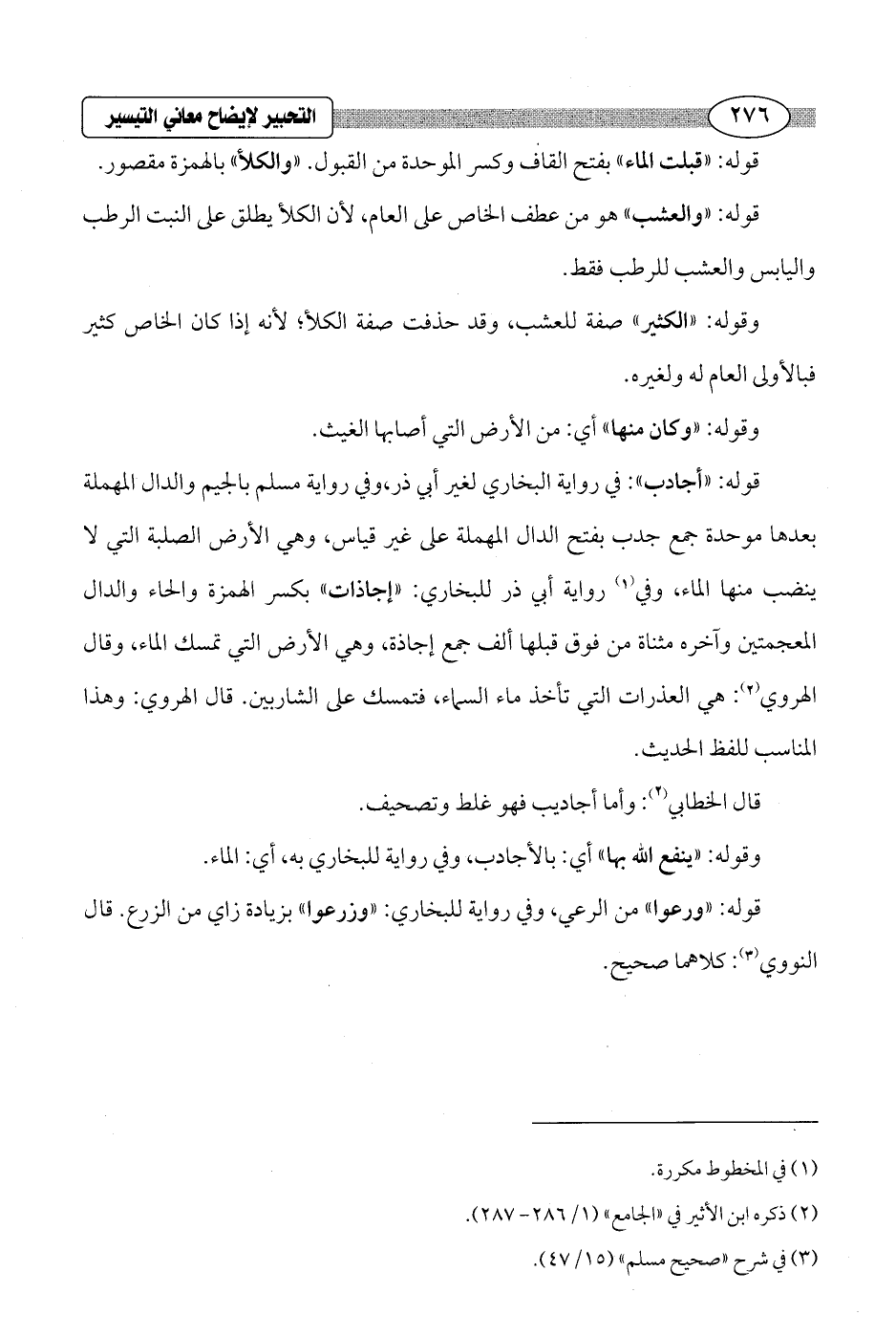 وقوله: "الكثير" صفة للعشب، وقد حذفت صفة الكلأ؛ لأنه إذا كان الخاص كثير فبالأولى العام له ولغيره.