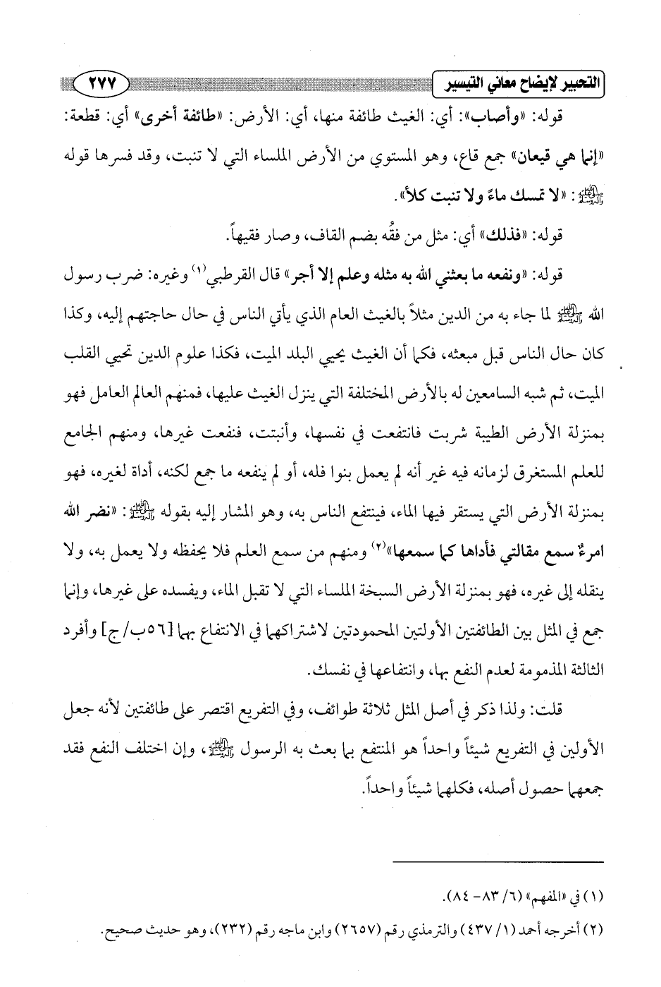 قلت: ولذا ذكر في أصل المثل ثلاثة طوائف، وفي التفريع اقتصر على طائفتين لأنه جعل الأولين في التفريع شيئاً واحداً هو المنتفع بما بعث به الرسول - صلى الله عليه وسلم -، وإن اختلف النفع قد جمعهما حصول أصله، فكلهما شيئاً واحداً.