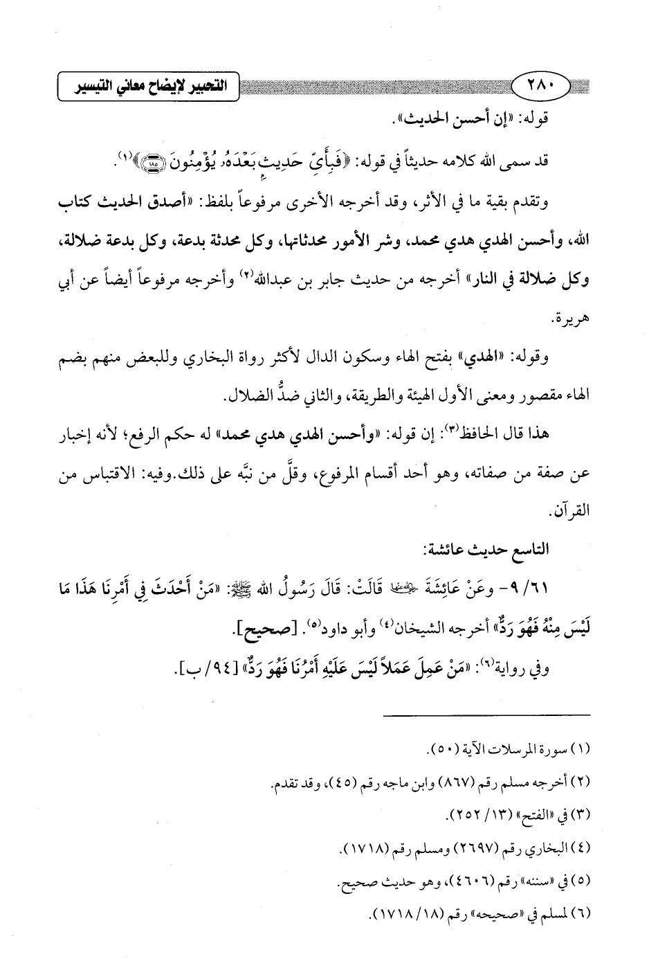 61/ 9 - وعَنْ عَائِشَةَ - رضي الله عنها - قَالَتْ: قَالَ رَسُولُ الله - صلى الله عليه وسلم -: "مَنْ أَحْدَثَ في أَمْرِنَا هَذَا مَا لَيْسَ مِنْهُ فَهُوَ رَدٌّ" أخرجه الشيخان (¬4) وأبو داود (¬5). [صحيح].
