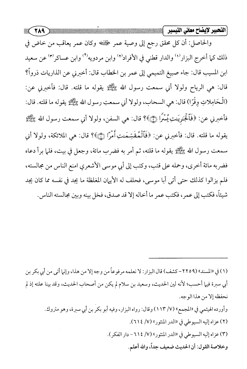 والحاصل: أن كل محقق رجع إلى وصية عمر - رضي الله عنه - وكان عمر يعاقب من خاض في ذلك كما أخرج البزار (¬1) والدارقطني في الأفراد (2) وابن مردويه (¬2) وابن عساكر (¬3) عن سعيد ابن المسيب قال: جاء صبيغ التميمي إلى عمر بن الخطاب قال: أخبرنا عن الذاريات ذرواً؟ قال: هي الرياح ولولا أني سمعت رسول الله - صلى الله عليه وسلم - يقوله ما قلته. قال: فأخبرني عن: (الْحَامِلَاتِ وِقْرًا) قال: هي السحاب، ولولا أني سمعت رسول الله - صلى الله عليه وسلم - يقوله ما قلته. قال: فأخبرني عن: {فَالْجَارِيَاتِ يُسْرًا (3)}؟ قال: هي السفن، ولولا أني سمعت رسول الله - صلى الله عليه وسلم - يقوله ما قلته. قال: فأخبرني عن: {فَالْمُقَسِّمَاتِ أَمْرًا (4)}؟ قال: هي الملائكة، ولولا أني سمعت رسول الله - صلى الله عليه وسلم - يقوله ما قلته، ثم أمر به فضرب مائة، وجعل في بيت، فلما برأ دعاه فضربه مائة أخرى، وحمله على قتب، وكتب إلى أبي موسى الأشعري امنع الناس من مجالسته، فلم يزالوا كذلك حتى أتى أبا موسى، فحلف له الأيمان المغلظة ما يجد في نفسه مما كان يجد شيئاً، فكتب إلى عمر، فكتب عمر ما أخاله إلا قد صدق، فخل بينه وبين مجالسته الناس.
