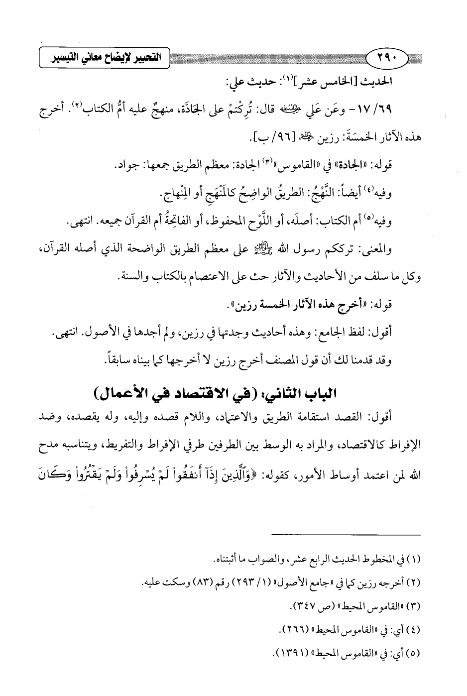 69/ 17 - وعَن عَلي - رضي الله عنه - قال: تُرِكْتمْ على الجَادَّة، منهجٌ عليه أمُّ الكتاب (¬2). أخرج هذه الآثار الخمسَةَ: رزين - رحمه الله -[96/ ب].