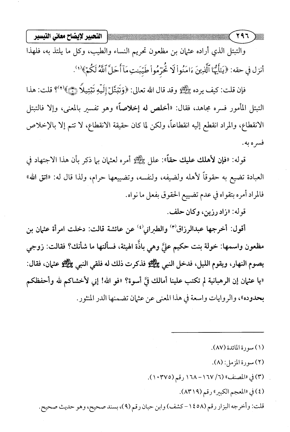 والتبتل الذي أراده عثمان بن مظعون تحريم النساء والطيب، وكل ما يلتذ به، فلهذا أنزل في حقه: {يَاأَيُّهَا الَّذِينَ آمَنُوا لَا تُحَرِّمُوا طَيِّبَاتِ مَا أَحَلَّ اللَّهُ لَكُمْ} (¬1).