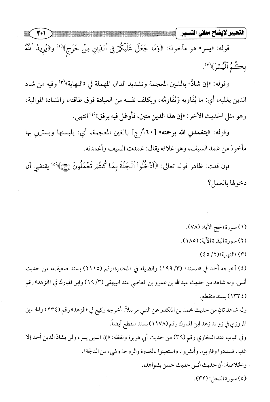 قوله: "يسر" هو مأخوذة: {وَمَا جَعَلَ عَلَيْكُمْ فِي الدِّينِ مِنْ حَرَجٍ} (¬1) و {يُرِيدُ اللَّهُ بِكُمُ الْيُسْرَ} (¬2).