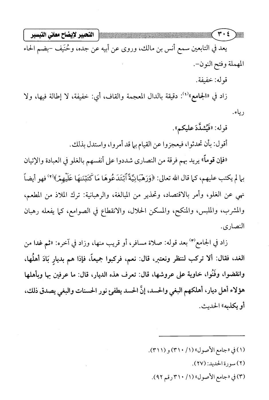 "فإن قوماً" يريد بهم فرقة من النصارى شددوا على أنفسهم بالغلو في العبادة والإتيان بما لم يكتب عليهم، كما قال الله تعالى: {وَرَهْبَانِيَّةً ابْتَدَعُوهَا مَا كَتَبْنَاهَا عَلَيْهِمْ} (¬2) فهو أيضاً نهي عن الغلو، وأمر بالاقتصاد، وتحذير من المبالغة، والرهبانية: ترك الملاذ من المطعم، والمشرب، والملبس، والمنكح، والمسكن الحلال، والانقطاع في الصوامع، كما يفعله رهبان النصارى.