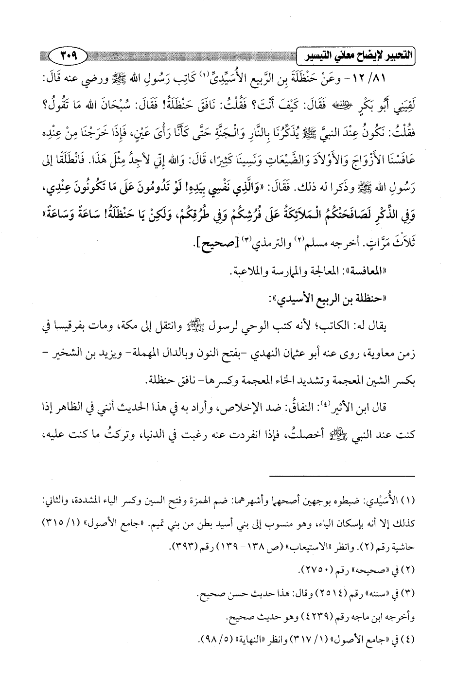 81/ 12 - وعَنْ حَنْظَلَةَ بِن الرَّبيع الأُسَيِّدِىِّ (¬1) كَاتِب رَسُولِ الله - صلى الله عليه وسلم - ورضي عنه قَالَ: لَقِيَنِي أَبُو بَكْرٍ - رضي الله عنه - فَقَالَ: كَيْفَ أَنْتَ؟ فَقُلْتُ: نَافَقَ حَنْظَلَةُ! فَقَالَ: سُبْحَانَ الله مَا تَقُولُ؟ فقُلْتُ: نَكُونُ عِنْدَ النبيَّ - صلى الله عليه وسلم - يذَكِّرُنَا بِالنَّارِ وَالْجَنَّةِ حَتَّى كَأَنَّا رَأْىَ عَيْنٍ، فَإِذَا خَرَجْنَا مِنْ عِنْدِه عَافَسْنَا الأَزْوَاجَ وَالأَوْلاَدَ وَالضَّيْعَاتِ وَنَسِينَا كَثِيرًا، قَالَ: وَالله إِنّي لأجِدُ مِثْلَ هَذَا. فَانْطَلَقْا إلى رَسُولِ الله - صلى الله عليه وسلم - وذَكرا له ذلك. فَقَالَ: "وَالَّذِي نَفْسِي بِيَدِهِ! لَوْ تَدُومُونَ عَلَى مَا تَكُوُنونَ عِندِي، وَفِي الذِّكْرِ لَصَافَحَتْكُمُ الْمَلاَئِكَةُ عَلَى فُرُشِكُمْ وَفِي طُرُقِكُمْ، وَلَكِنْ يَا حَنْظَلَةُ! سَاعَةً وَسَاعَةً" ثَلاَثَ مَرَّاتٍ. أخرجه مسلم (¬2) والترمذي (¬3) [صحيح].