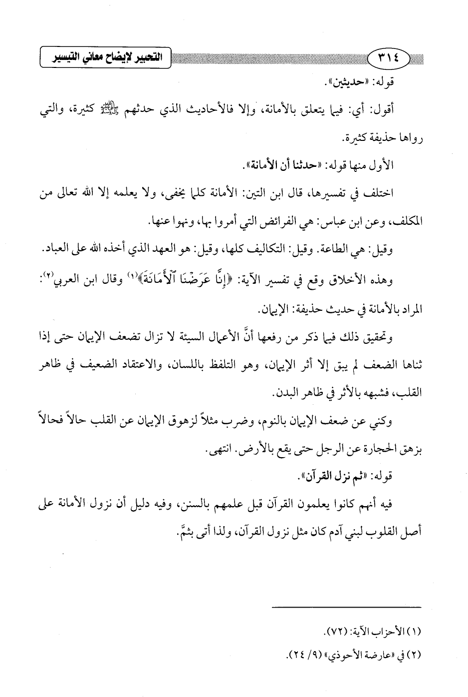 وهذه الأخلاق وقع في تفسير الآية: {إِنَّا عَرَضْنَا الْأَمَانَةَ} (¬1) وقال ابن العربي (¬2): المراد بالأمانة في حديث حذيفة: الإيمان.