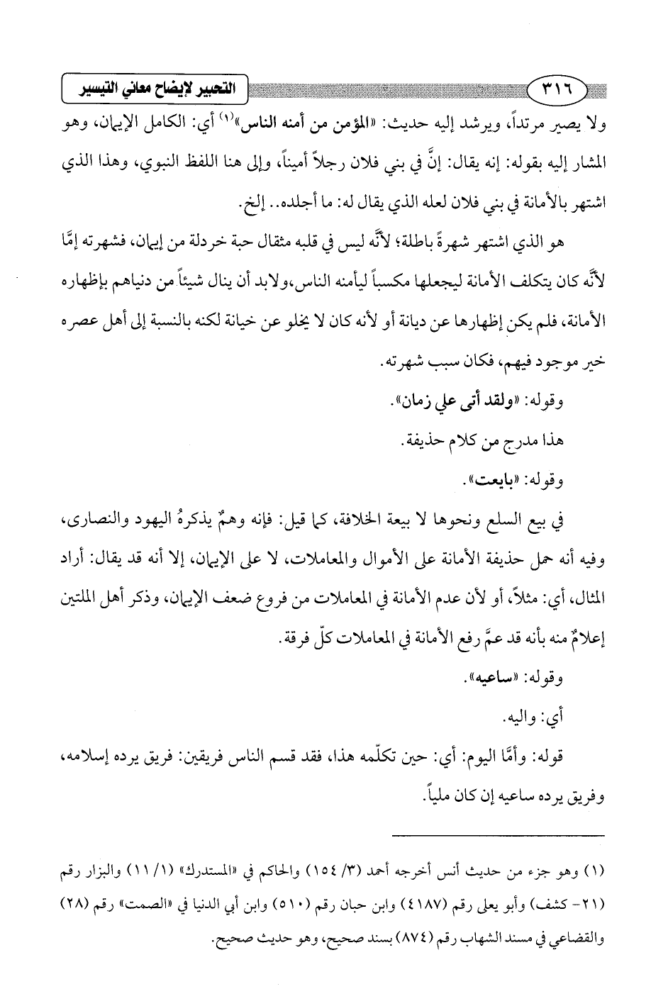 ولا يصير مرتداً، ويرشد إليه حديث: "المؤمن من أمنه الناس" (¬1) أي: الكامل الإيمان, وهو المشار إليه بقوله: إنه يقال: إنَّ في بني فلان رجلاً أميناً، وإلى هنا اللفظ النبوي، وهذا الذي اشتهر بالأمانة في بني فلان لعله الذي يقال له: ما أجلده .. إلخ.