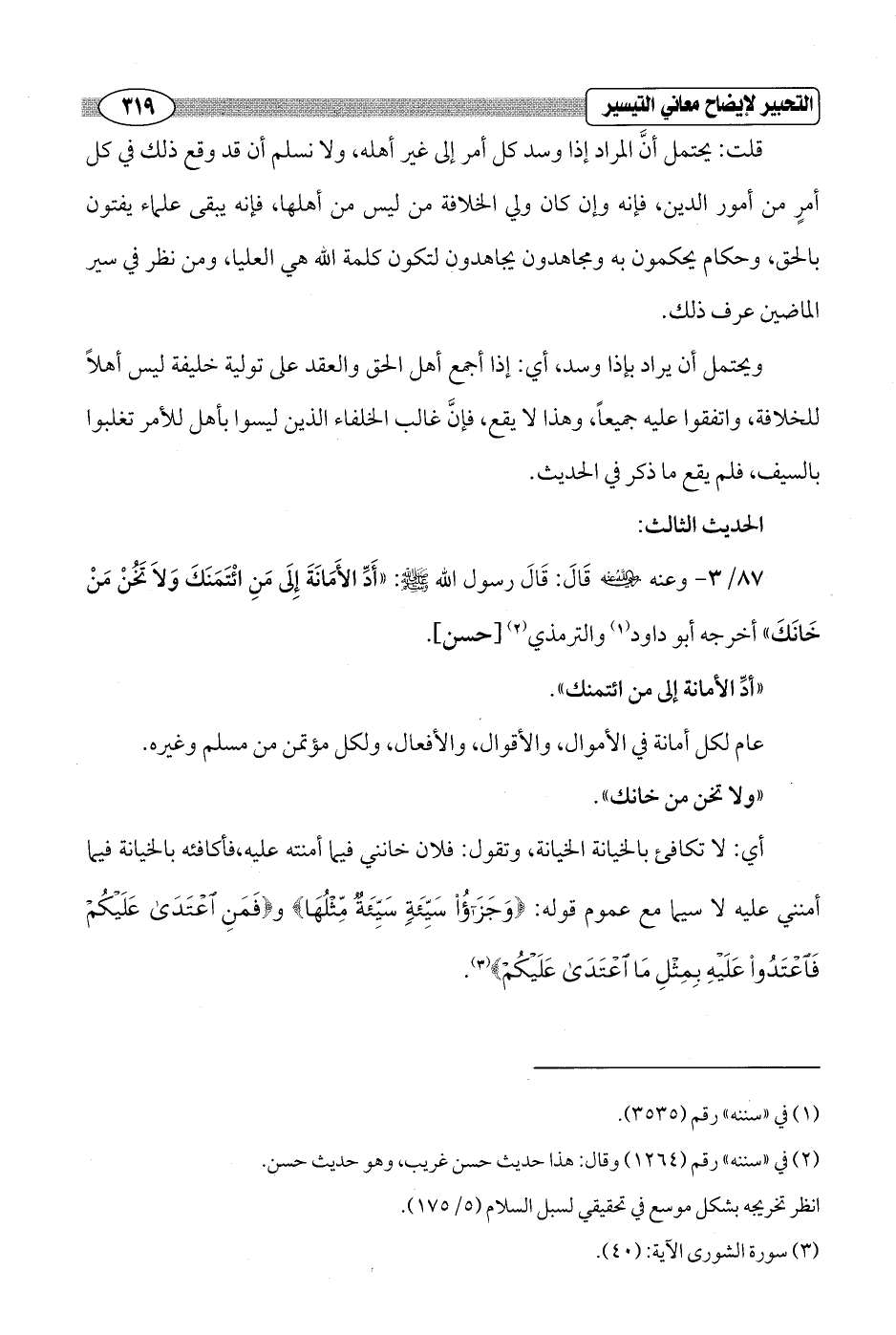 87/ 3 - وعنه - رضي الله عنه - قَالَ: قَالَ رسول الله - صلى الله عليه وسلم -: "أَدِّ الأَمَانَةَ إِلَى مَنِ ائْتَمَنَكَ وَلاَ تَخُنْ مَنْ خَانَكَ" أخرجه أبو داود (¬1) والترمذي (¬2) [حسن].