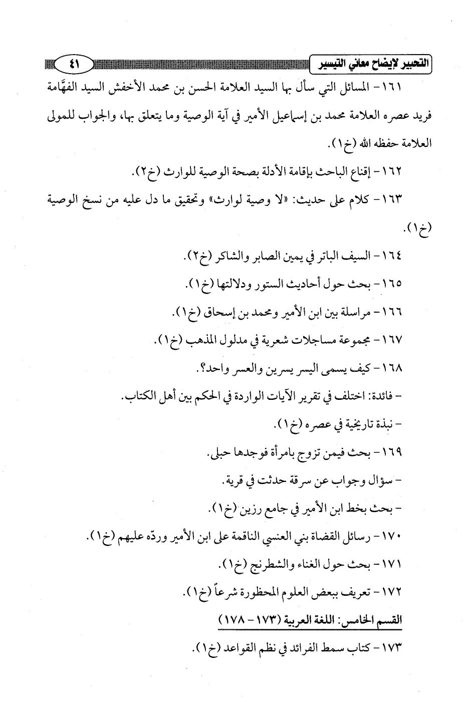 161 - المسائل التي سأل بها السيد العلامة الحسن بن محمد الأخفش السيد الفهَّامة فريد عصره العلامة محمد بن إسماعيل الأمير في آية الوصية وما يتعلق بها، والجواب للمولى العلامة حفظه الله (خ 1).