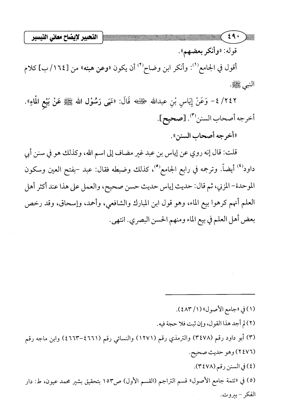 242/ 4 - وَعَنْ إِيَاسِ بْنِ عبد الله - رضي الله عنه - قَالَ: "نَهَى رَسُوْل الله - صلى الله عليه وسلم - عنْ بَيْعِ المْاءِ". أخرجه أصحاب السنن (¬3). [صحيح].