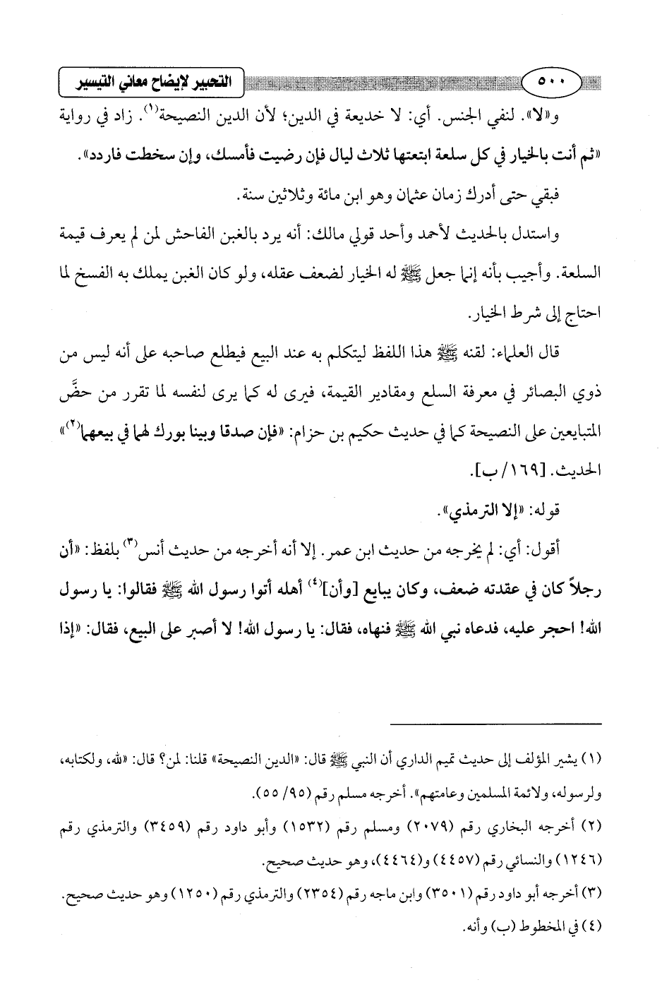 (¬1) يشير المؤلف إلى حديث تميم الداري أن النبي - صلى الله عليه وسلم - قال: "الدين النصيحة" قلنا: لمن؟ قال: "لله، ولكتابه، ولرسوله، ولائمة المسلمين وعامتهم". أخرجه مسلم رقم (95/ 55).