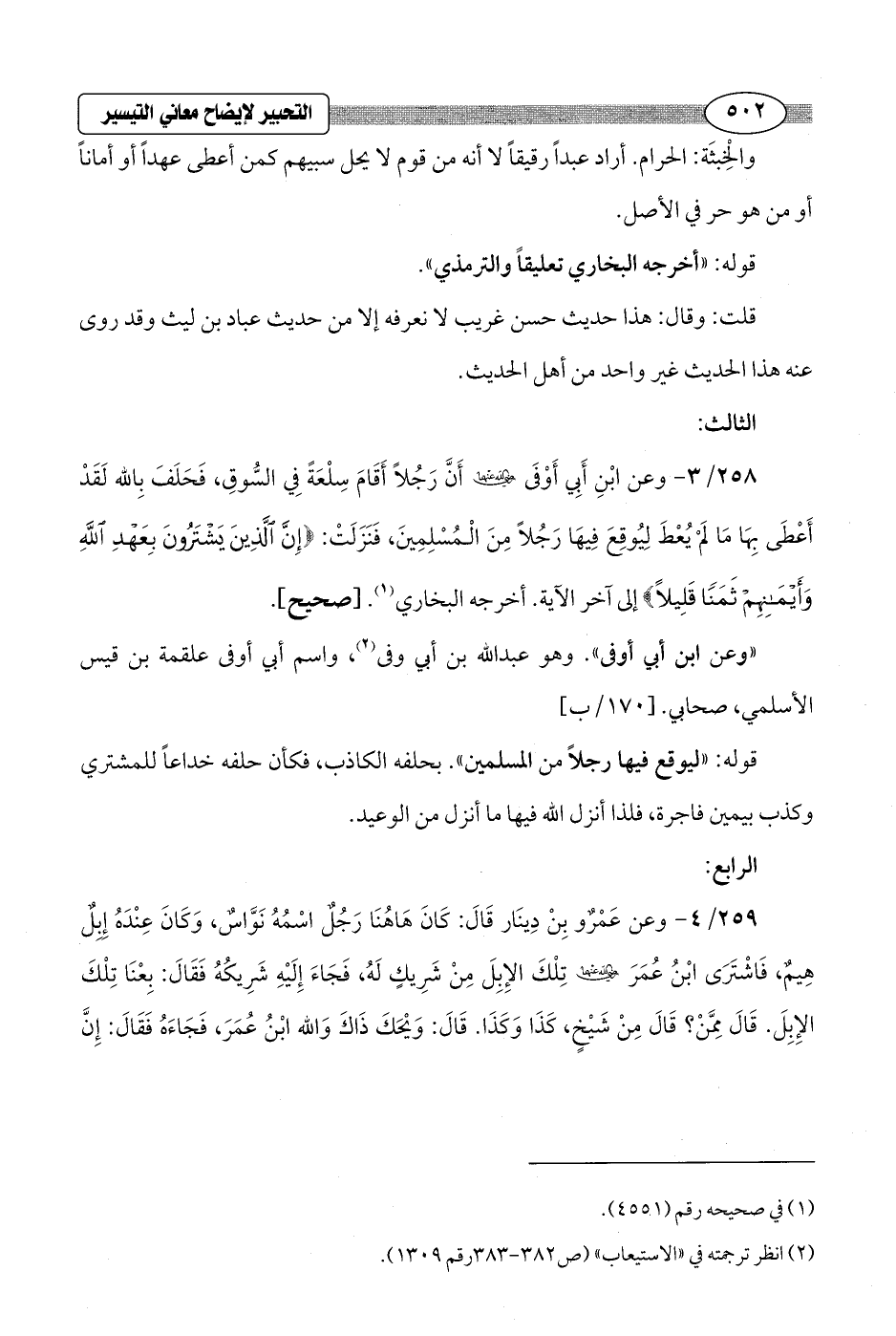 258/ 3 - وعن ابْنِ أَبِي أَوْفَى - رضي الله عنهما - أَنَّ رَجُلاً أَقَامَ سِلْعَةً فِي السُّوقِ، فَحَلَفَ بِالله لَقَدْ أَعْطَى بِهَا مَا لَمْ يُعْطَ لِيُوقِعَ فِيهَا رَجُلاً مِنَ الْمُسْلِمِينَ، فَنَزَلَتْ: {إِنَّ الَّذِينَ يَشْتَرُونَ بِعَهْدِ اللَّهِ وَأَيْمَانِهِمْ ثَمَنًا قَلِيلًا} إلى آخر الآية. أخرجه البخاري (¬1). [صحيح].