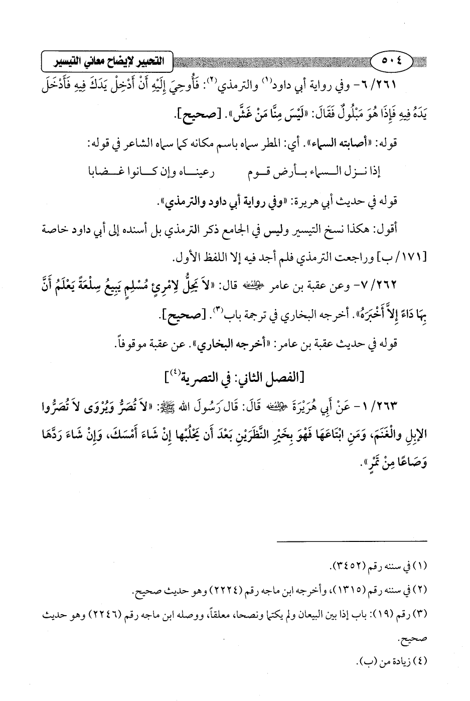263/ 1 - عَنْ أَبِي هُرَيْرَةَ - رضي الله عنه - قَالَ: قَالَ رَسُولَ الله - صلى الله عليه وسلم -: "لاَ تُصَرُّ وَيُرْوَى لاَ تُصَرُّوا الإبِلِ والْغَنَمَ، وَمَنِ ابْتَاعَهَا فَهْوَ بِخَيْرِ النَّظَرَيْنِ بَعْدَ أَن يَحْلُبْها إِنْ شَاءَ أَمْسَكَ، وَإِنْ شَاءَ رَدَّهَا وَصَاعًا مِنْ تَمْرٍ".