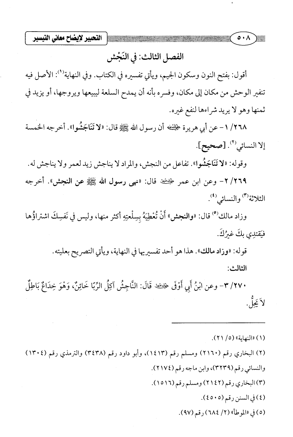 268/ 1 - عن أبي هريرة - رضي الله عنه - أن رسول الله - صلى الله عليه وسلم - قال: "لا تَنَاجَشُوا". أخرجه الخمسة إلا النسائي (¬2). [صحيح].