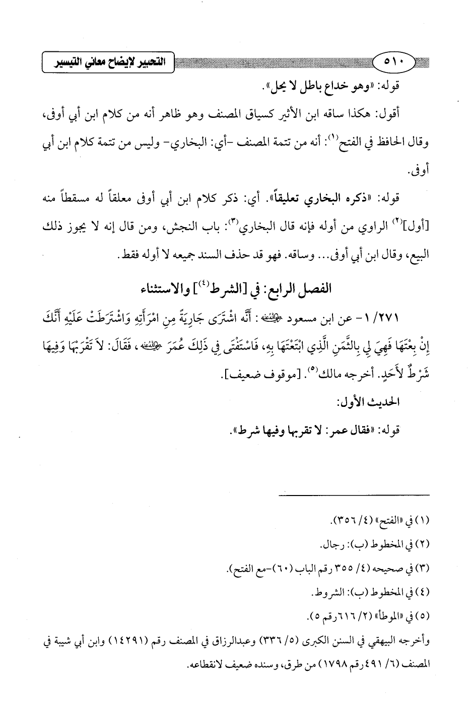 271/ 1 - عن ابن مسعود - رضي الله عنه -: أَنَّه اشْتَرَى جَارِيَةً مِنِ امْرَأَتِهِ وَاشْتَرَطَتْ عَلَيْهِ أَنَّكَ إِنْ بِعْتَهَا فَهِيَ لِي بِالثَّمَنِ الَّذِي ابْتَعْتَهَا بِهِ، فَاسْتَفْتَى فِي ذَلِكَ عُمَرَ - رضي الله عنه -، فَقَالَ: لاَ تَقْرَبْهَا وَفِيهَا شَرْطٌ لأَحَدٍ. أخرجه مالك (¬5). [موقوف ضعيف].