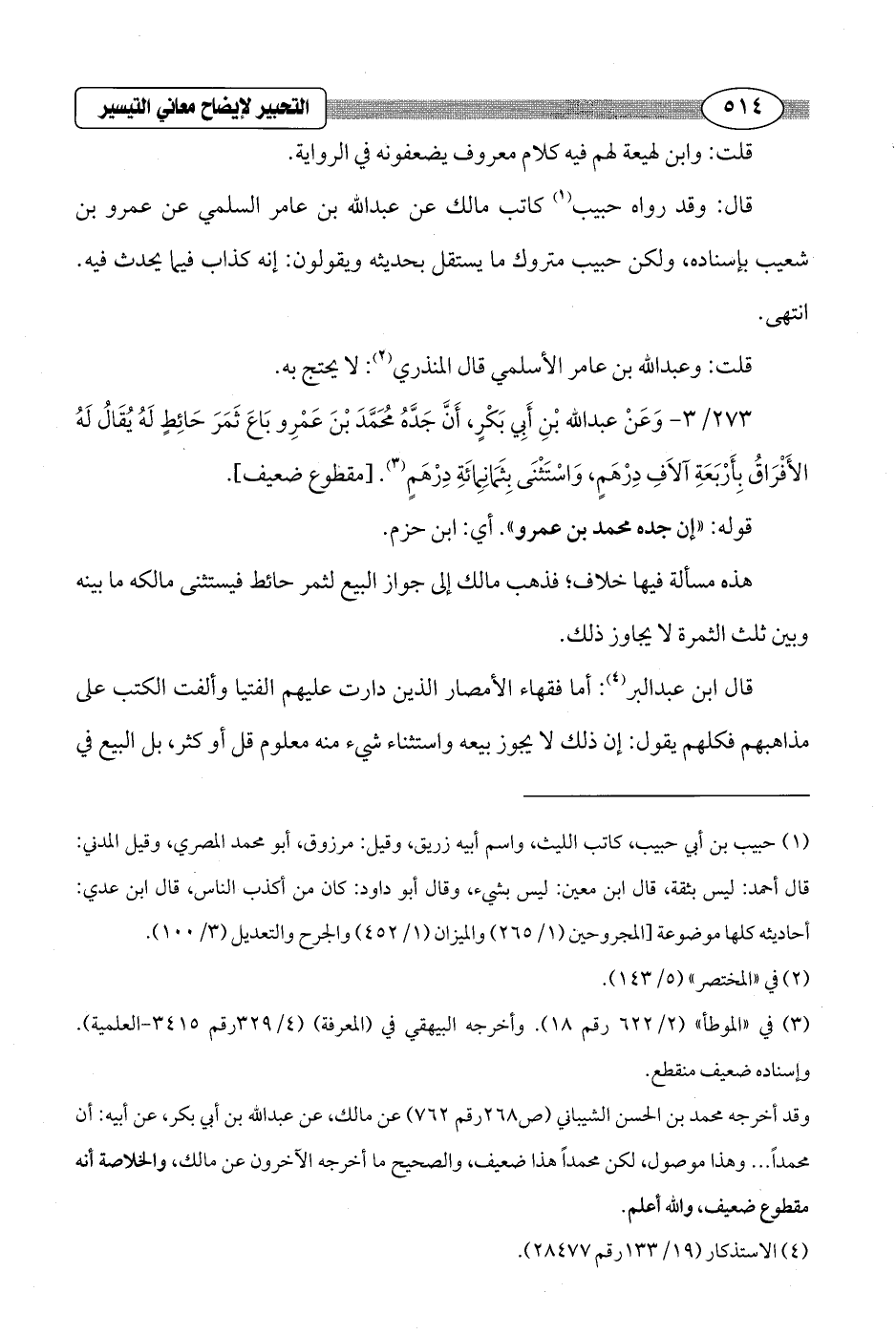 قال: وقد رواه حبيب (¬1) كاتب مالك عن عبد الله بن عامر السلمي عن عمرو بن شعيب بإسناده، ولكن حبيب متروك ما يستقل بحديثه ويقولون: إنه كذاب فيما يحدث فيه. انتهى.