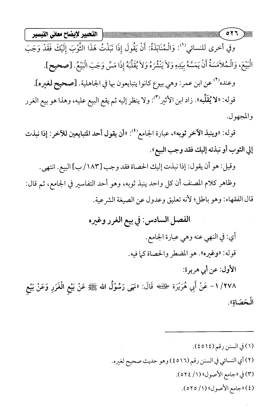 وفي أخرى للنسائي (¬1): وَالْمُنَابَذَةُ: أَنْ يَقُولَ إِذَا نبَذْتُ هَذَا الثَّوْبَ إِلَيْكَ فَقَدْ وَجَبَ الْبَيْعَ، وَالْمُلاَمَسَةُ أَنْ يَمَسَّهُ بِيَده وَلاَ يَنْشُرهُ وَلاَ يُقَلِّبَهُ إِذَا مَسَّ وَجَبَ الْبَيْعُ. [صحيح].