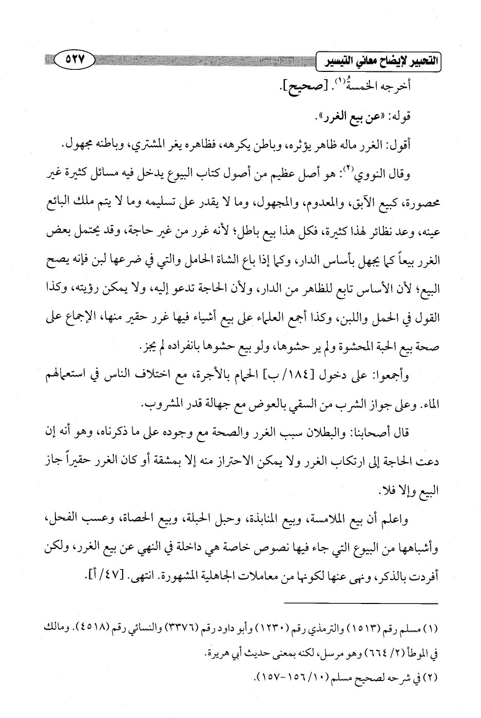 وقال النووي (¬2): هو أصل عظيم من أصول كتاب البيوع يدخل فيه مسائل كثيرة غير محصورة، كبيع الآبق، والمعدوم، والمجهول، وما لا يقدر على تسليمه وما لا يتم ملك البائع عينه، وعد نظائر لهذا كثيرة، فكل هذا بيع باطل؛ لأنه غرر من غير حاجة، وقد يحتمل بعض الغرر بيعاً كما يجهل بأساس الدار، وكما إذا باع الشاة الحامل والتي في ضرعها لبن فإنه يصح البيع؛ لأن الأساس تابع للظاهر من الدار، ولأن الحاجة تدعو إليه، ولا يمكن رؤيته، وكذا القول في الحمل واللبن، وكذا أجمع العلماء على بيع أشياء فيها غرر حقير منها، الإجماع على صحة بيع الحبة المحشوة ولم ير حشوها، ولو بيع حشوها بانفراده لم يجز.