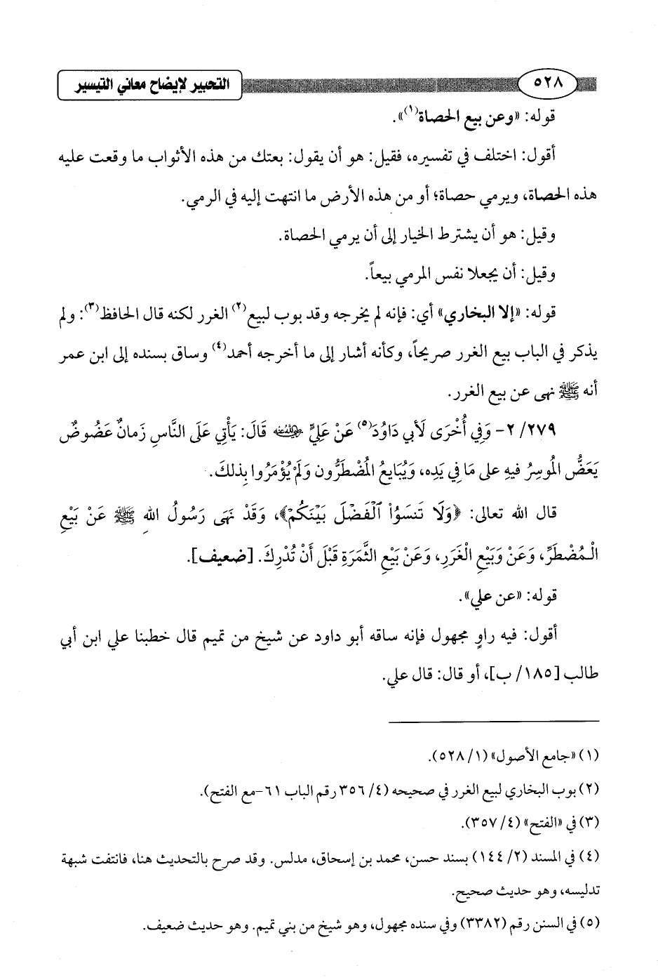 قوله: "إلا البخاري" أي: فإنه لم يخرجه وقد بوب لبيع (¬2) الغرر لكنه قال الحافظ (¬3): ولم يذكر في الباب بيع الغرر صريحاً، وكأنه أشار إلى ما أخرجه أحمد (¬4) وساق بسنده إلى ابن عمر أنه - صلى الله عليه وسلم - نهى عن بيع الغرر.