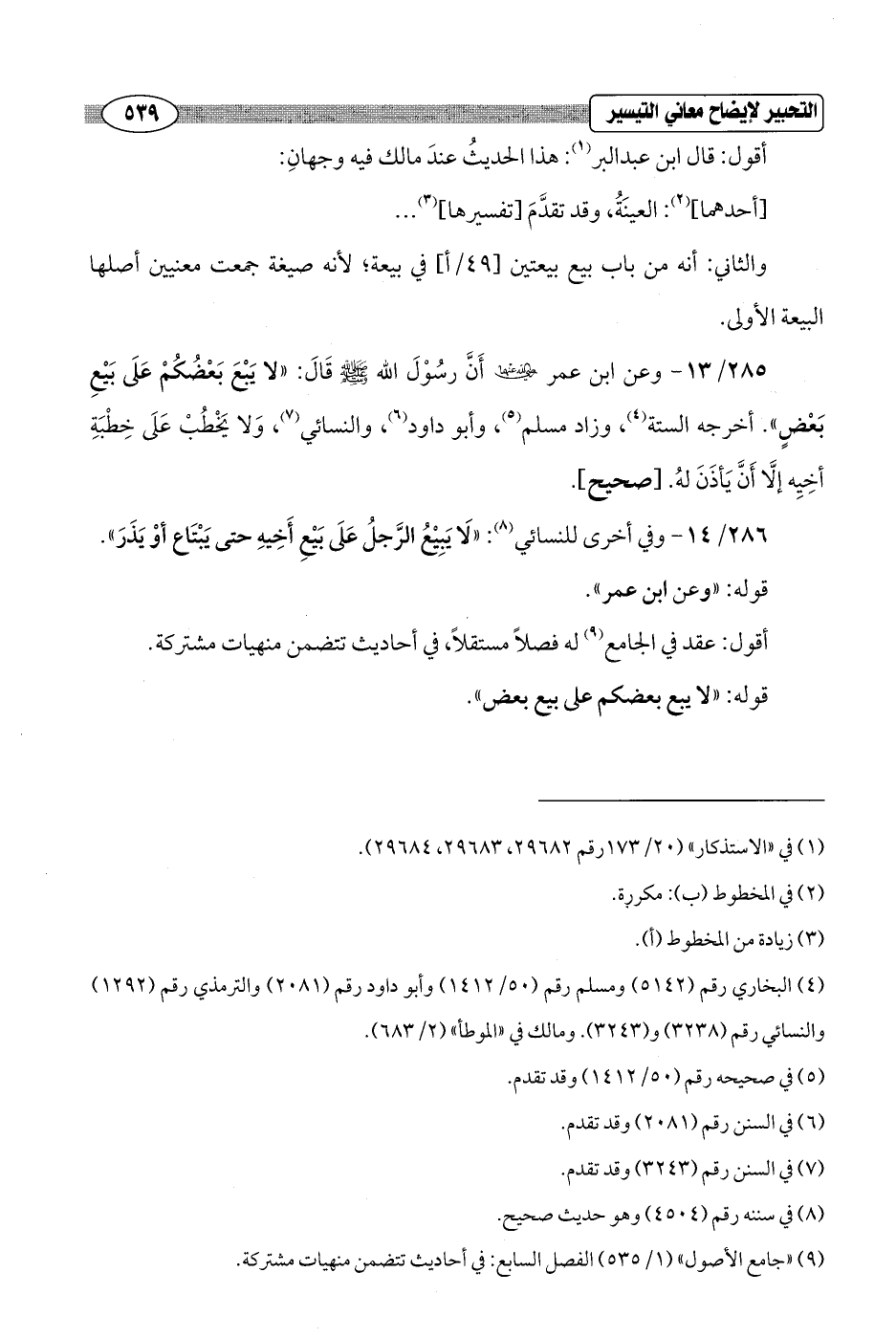 285/ 13 - وعن ابن عمر - رضي الله عنهما - أَنَّ رسُوْلَ الله - صلى الله عليه وسلم - قَالَ: "لا يَبْعَ بَعْضُكُمْ عَلَى بَيْعِ بَعْضٍ". أخرجه الستة (¬4)، وزاد مسلم (¬5)، وأبو داود (¬6)، والنسائي (¬7)، وَلا يَخْطُبْ عَلَى خِطْبَةِ أخِيِه إلَّا أَنَّ يَأذَنَ لهُ. [صحيح].