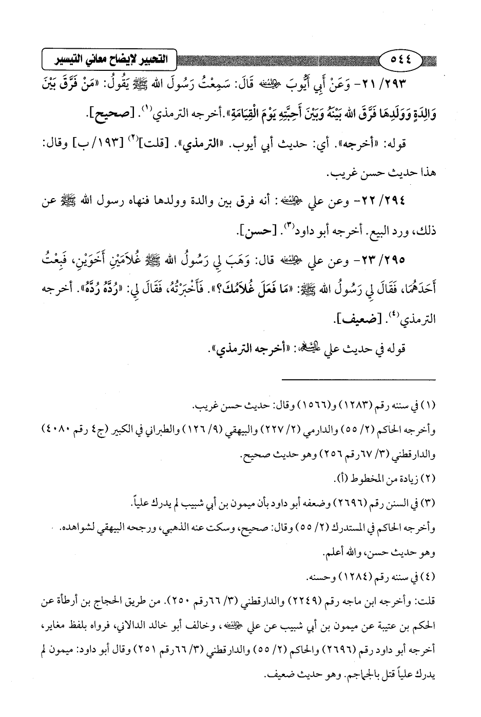 293/ 21 - وَعَنْ أَبِي أَيُّوبَ - رضي الله عنه - قَالَ: سَمِعْتُ رَسُولَ الله - صلى الله عليه وسلم - يَقُولُ: "مَنْ فَرَّقَ بَيْنَ وَالِدَةٍ وَوَلَدِهَا فَرَّقَ الله بَيْنَهُ وَبيْنَ أَحِبَّتِهِ يَوْمَ الْقِيَامَةِ". أخرجه الترمذي (¬1). [صحيح].