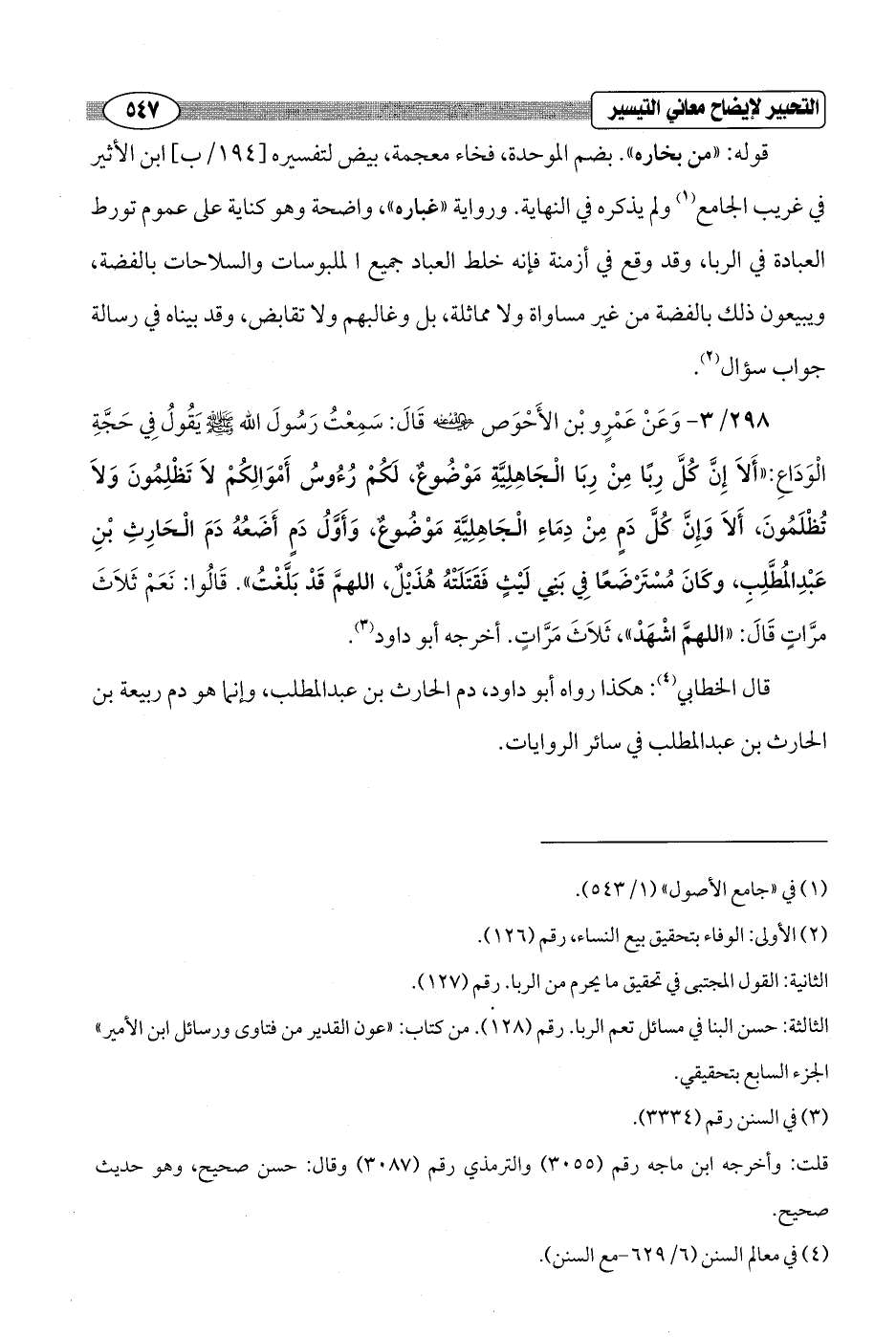 298/ 3 - وَعَنْ عَمْرٍو بْن الأَحْوَص - رضي الله عنه - قَالَ: سَمِعْتُ رَسُولَ الله - صلى الله عليه وسلم - يَقُولُ فِي حَجَّةِ الْوَدَاعِ: "أَلاَ إِنَّ كُلَّ رِبًا مِنْ رِبَا الْجَاهِلِيَّةِ مَوْضُوعٌ، لَكُمْ رُءُوسُ أَمْوَالِكُمْ لاَ تَظْلِمُونَ وَلاَ تُظْلَمُونَ، أَلاَ وَإِنَّ كُلَّ دَمٍ مِنْ دِمَاءِ الْجَاهِلِيَّةِ مَوْضُوعٌ، وَأَوَّلُ دَمٍ أَضَعُهُ دَمَ الْحَارِثِ بْنِ عَبْدِ المُطَّلِبِ، وكَانَ مُسْتَرْضَعًا فِي بَنِي لَيْثٍ فَقَتَلَتْهُ هُذَيْلٌ، اللهمَّ قَدْ بَلَّغْتُ". قَالُوا: نَعَمْ ثَلاَثَ مرَّاتٍ قَالَ: "اللهمَّ اشْهَدْ"، ثَلاَثَ مَرَّاتٍ. أخرجه أبو داود (¬3).