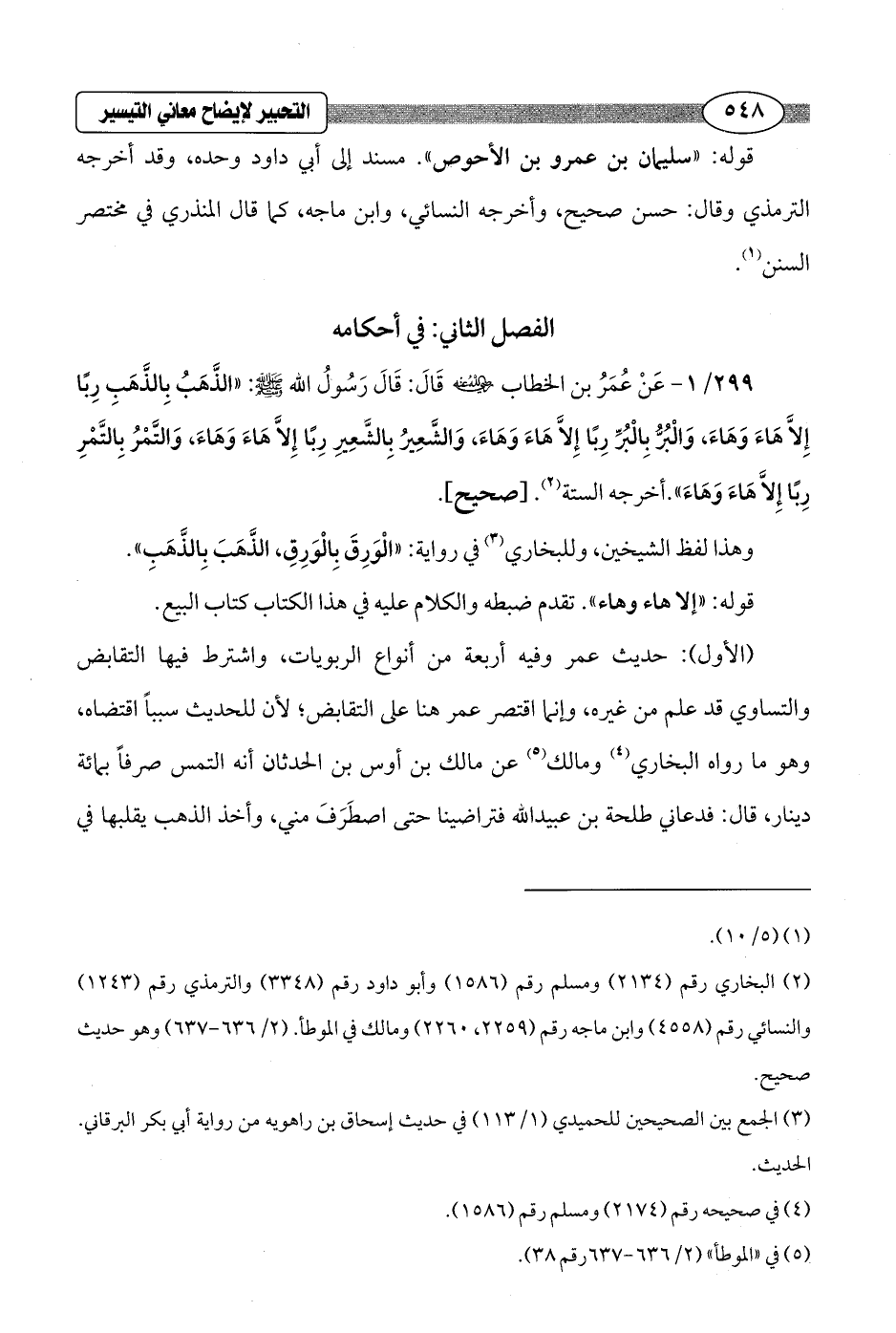 299/ 1 - عَنْ عُمَرُ بن الخطاب - رضي الله عنه - قَالَ: قَالَ رَسُولُ الله - صلى الله عليه وسلم -: "الذَّهَبُ بِالذَّهَبِ رِبًا إِلاَّ هَاءَ وَهَاءَ، وَالْبُرُّ بِالْبُرِّ رِبًا إِلاَّ هَاءَ وَهَاءَ, وَالشَّعِيرُ بِالشَّعِيرِ رِبًا إِلاَّ هَاءَ وَهَاءَ، وَالتَّمْرُ بِالتَّمْرِ رِبًا إِلاَّ هَاءَ وَهَاءَ". أخرجه الستة (¬2). [صحيح].