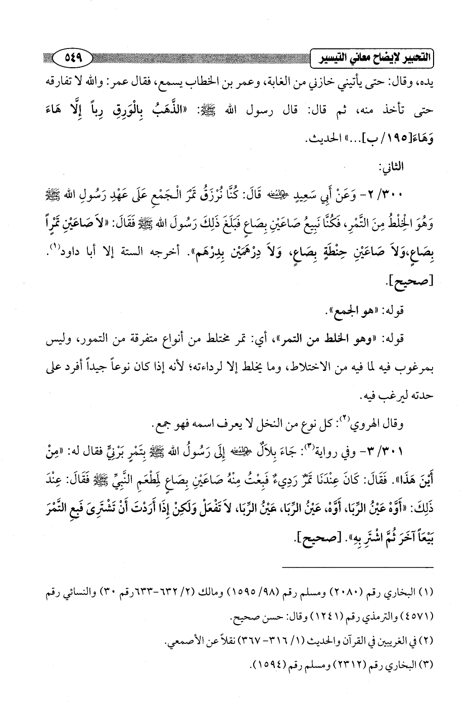300/ 2 - وَعَنْ أَبِي سَعِيدٍ - رضي الله عنه - قَالَ: كُنَّا نُرْزَقُ تَمْرَ الْجَمْعِ عَلَى عَهْدِ رَسُولِ الله - صلى الله عليه وسلم - وَهُوَ الخلْطُ مِنَ التَّمْرِ، فَكُنَّا نَبِيعُ صَاعيْنِ بِصَاعٍ فَبَلَغَ ذَلِكَ رَسُولَ الله - صلى الله عليه وسلم - فَقَالَ: "لاَ صَاعينِ تَمْراً بِصَاعٍ، وَلاَ صَاعَيْنِ حِنْطَةٍ بِصَاعٍ، وَلاَ دِرْهَمَيْن بِدِرْهَم". أخرجه الستة إلا أبا داود (¬1). [صحيح].