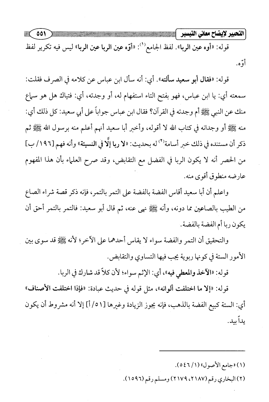 قوله: "فقال أبو سعيد سألته". أي: أنه سأل ابن عباس عن كلامه في الصرف فقلت: سمعته أي: يا ابن عباس، فهو بفتح التاء استفهام له، أو وجدته، أي: فتياك هل هو سماع منك عن النبي - صلى الله عليه وسلم - أم وجدته في القرآن؟ فقال ابن عباس جواباً على أبي سعيد: كل ذلك أي: منه - صلى الله عليه وسلم - أو وجدانه في كتاب الله لا أقوله، وأخبر أبا سعيد أنهم أعلم منه برسول الله - صلى الله عليه وسلم - ثم ذكر أن مستنده في ذلك خبر أسامة (¬2) له بحديث: "لا ربا إلَّا في النسيئة" وأنه فهم [196/ ب] من الحصر أنه لا يكون الربا في الفضل مع التقابض، وقد صرح العلماء بأن هذا المفهوم عارضه منطوق أقوى منه.