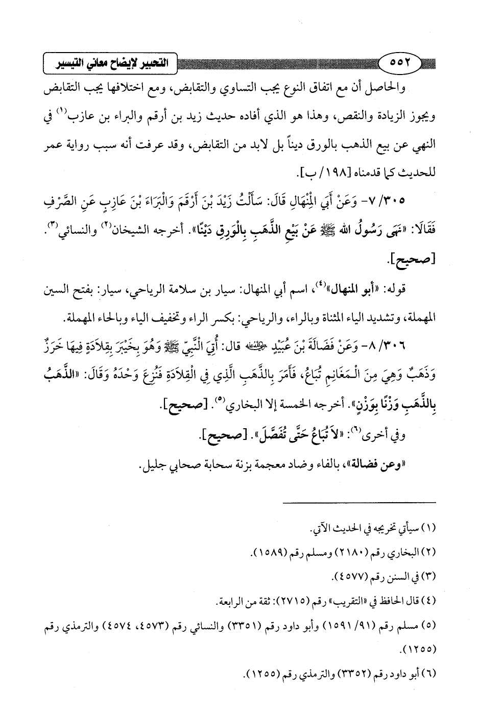 305/ 7 - وَعَنْ أَبَي الْمِنْهَالِ قَالَ: سَألْتُ زَيْدَ بْنَ أَرْقَمَ وَالْبَرَاءَ بْنَ عَازِبٍ عَنِ الصَّرْفِ فَقَالَا: "نَهَى رَسُولُ الله - صلى الله عليه وسلم - عنْ بَيع الذَّهَبِ بِالْوَرِقِ دَيْنًا". أخرجه الشيخان (¬2) والنسائي (¬3). [صحيح].