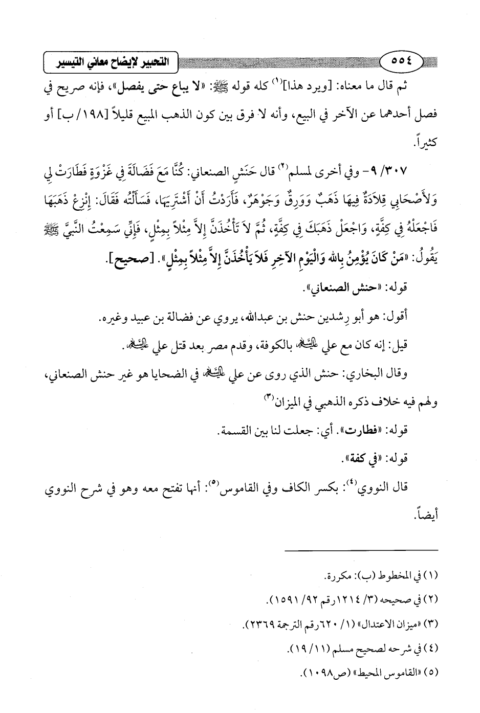 307/ 9 - وفي أخرى لمسلم (¬2) قال حَنَشٍ الصنعاني: كُنَّا مَعَ فَضَالَةَ فِي غَزْوَةٍ فَطَارَتْ لِي وَلأَصْحَابِي قِلاَدَةٌ فِيهَا ذَهَبٌ وَوَرِقٌ وَجَوْهَرٌ، فَأَرَدْتُ أَنْ أَشْتَرِيَهَا، فَسَألْتُه فَقَالَ: إِنْزِعْ ذَهَبَهَا فَاجْعَلْهُ فِي كِفَّةٍ، وَاجْعَلْ ذَهَبَكَ فِي كِفَّةٍ، ثُمَّ لاَ تَأْخُذَنَّ إِلاَّ مِثْلاً بِمِثْلٍ، فَإِنِّي سَمِعْتُ النَّبيَّ - صلى الله عليه وسلم - يَقُولُ: "مَنْ كَانَ يُؤْمِنُ بِالله وَالْيَوْمِ الآخِرِ فَلاَ يَأْخُذَنَّ إِلاَّ مِثْلاً بِمِثْلٍ". [صحيح].
