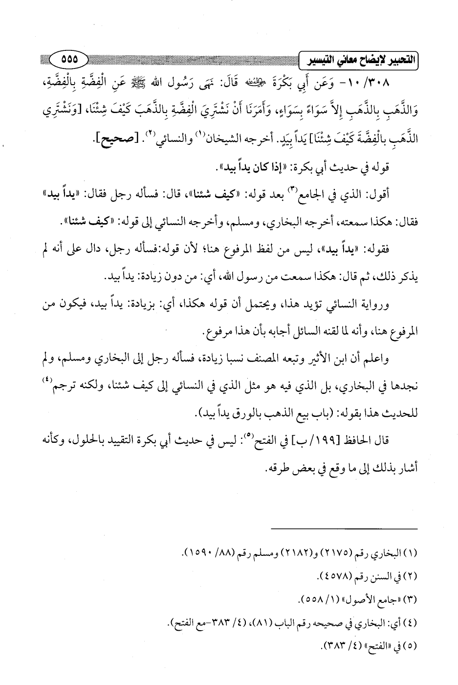 308/ 10 - وَعَن أَبِي بَكْرَةَ - رضي الله عنه - قَالَ: نَهَى رَسُول الله - صلى الله عليه وسلم - عنِ الْفِضَّةِ بِالْفِضَّةِ، وَالذَّهَبِ بِالذَّهَبِ إِلاَّ سَوَاءً بِسَوَاءٍ، وَأَمَرَنَا أَنْ نَشْتَرِيَ الْفِضَّةِ بِالذَّهَبَ كَيْفَ شِئْنَا، [وَنَشْتَرِي الذَّهَبِ بالْفِضَّةَ كَيْفَ شِئْنَا] يَداً بِيَدٍ. أخرجه الشيخان (¬1) والنسائي (¬2). [صحيح].