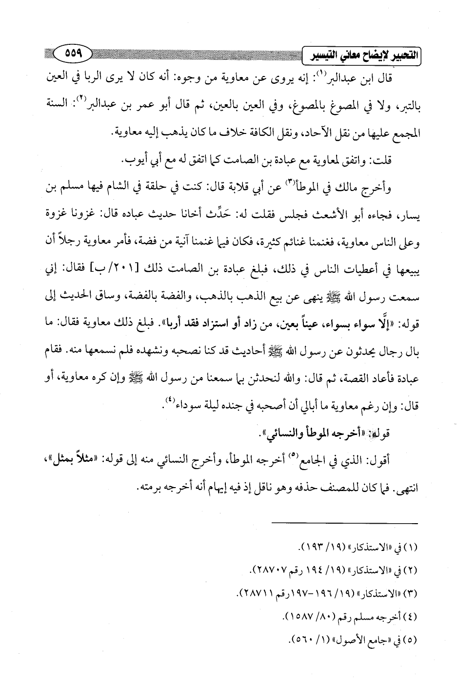 قال ابن عبد البر (¬1): إنه يروى عن معاوية من وجوه: أنه كان لا يرى الربا في العين بالتبر، ولا في المصوغ بالمصوغ، وفي العين بالعين، ثم قال أبو عمر بن عبد البر (¬2): السنة المجمع عليها من نقل الآحاد، ونقل الكافة خلاف ما كان يذهب إليه معاوية.