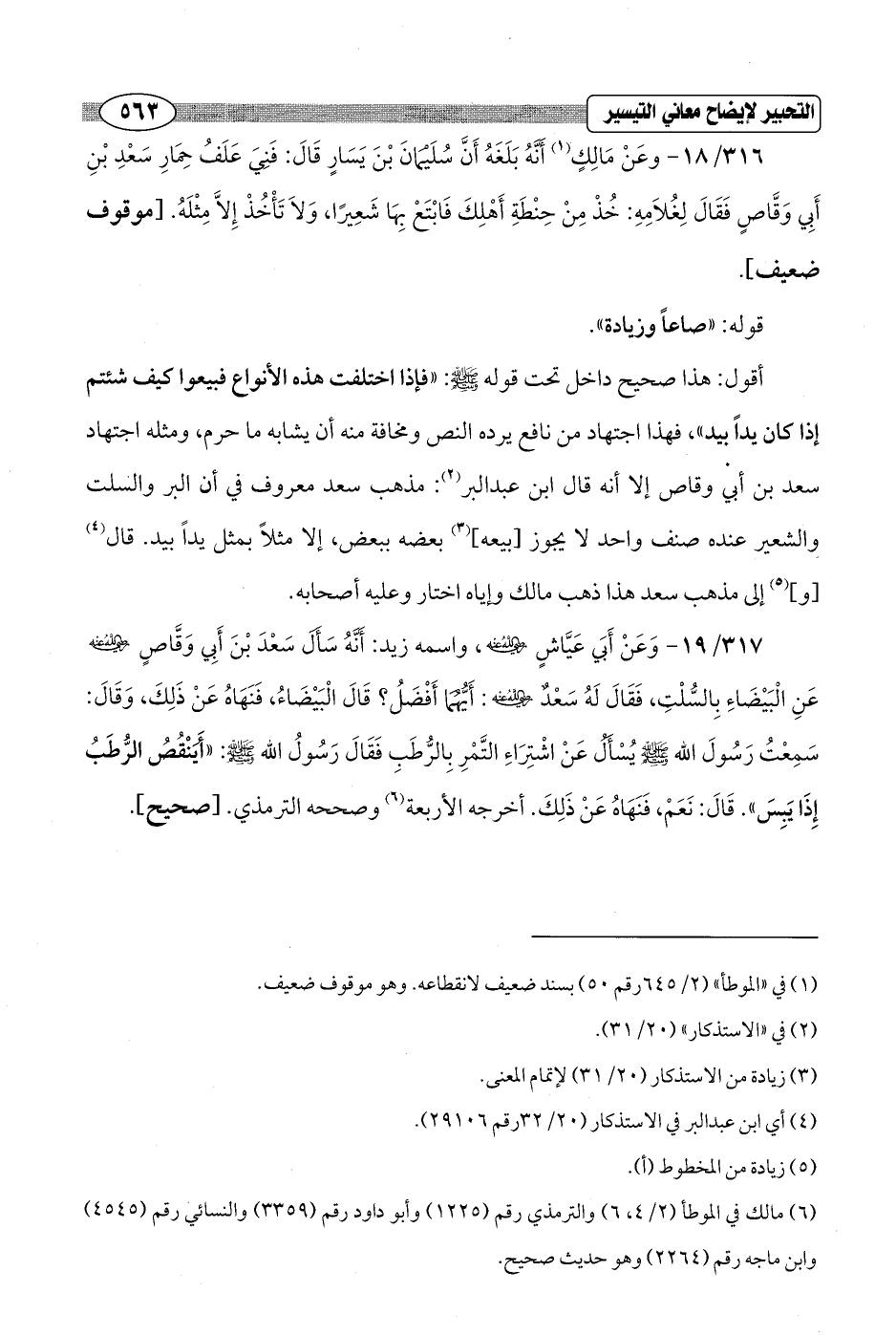 316/ 18 - وعَنْ مَالِكٍ (¬1) أَنَّهُ بَلَغَهُ أَنَّ سُلَيْمَانَ بْنَ يَسَارٍ قَالَ: فَنِيَ عَلَفُ حِمَارِ سَعْدِ بْنِ أَبِي وَقَّاصٍ فَقَالَ لِغُلاَمِهِ: خُذْ مِنْ حِنْطَةِ أَهْلِكَ فَابْتَعْ بِهَا شَعِيرًا، وَلاَ تَأْخُذْ إِلاَّ مِثْلَهُ. [موقوف ضعيف].