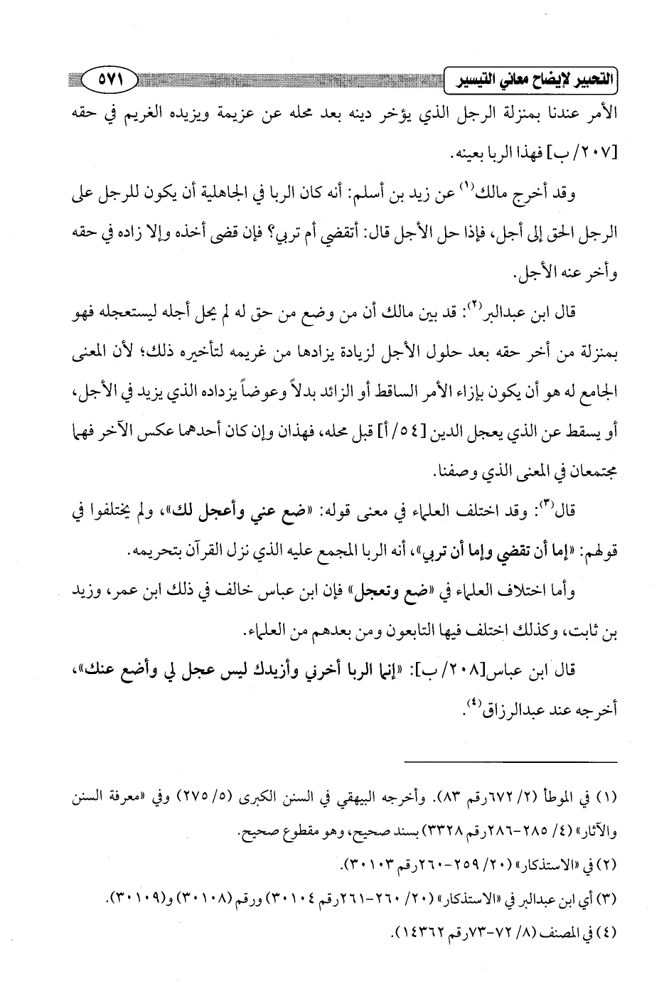 قال ابن عباس [208/ ب]: "إنما الربا أخرني وأزيدك ليس عجل لي وأضع عنك"، أخرجه عند عبد الرزاق (¬4).