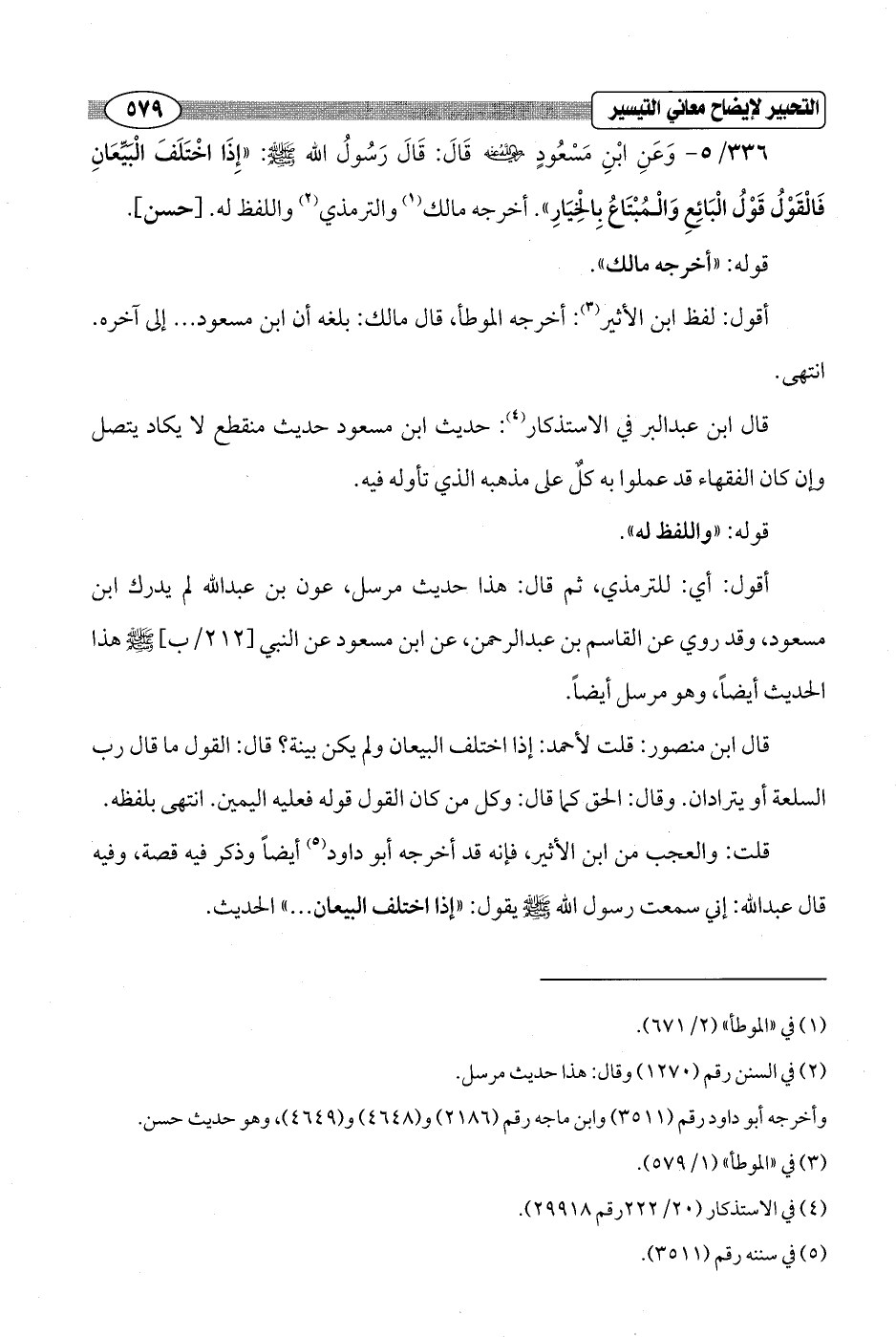 336/ 5 - وَعَنِ ابْنِ مَسْعُودٍ - رضي الله عنه - قَالَ: قَالَ رَسُولُ الله - صلى الله عليه وسلم -: "إِذَا اخْتَلَفَ الْبَيِّعَانِ فَالْقَوْلُ قَوْلُ الْبَائِعِ وَالْمُبْتَاعُ بِالْخِيَار". أخرجه مالك (¬1) والترمذي (¬2) واللفظ له. [حسن].