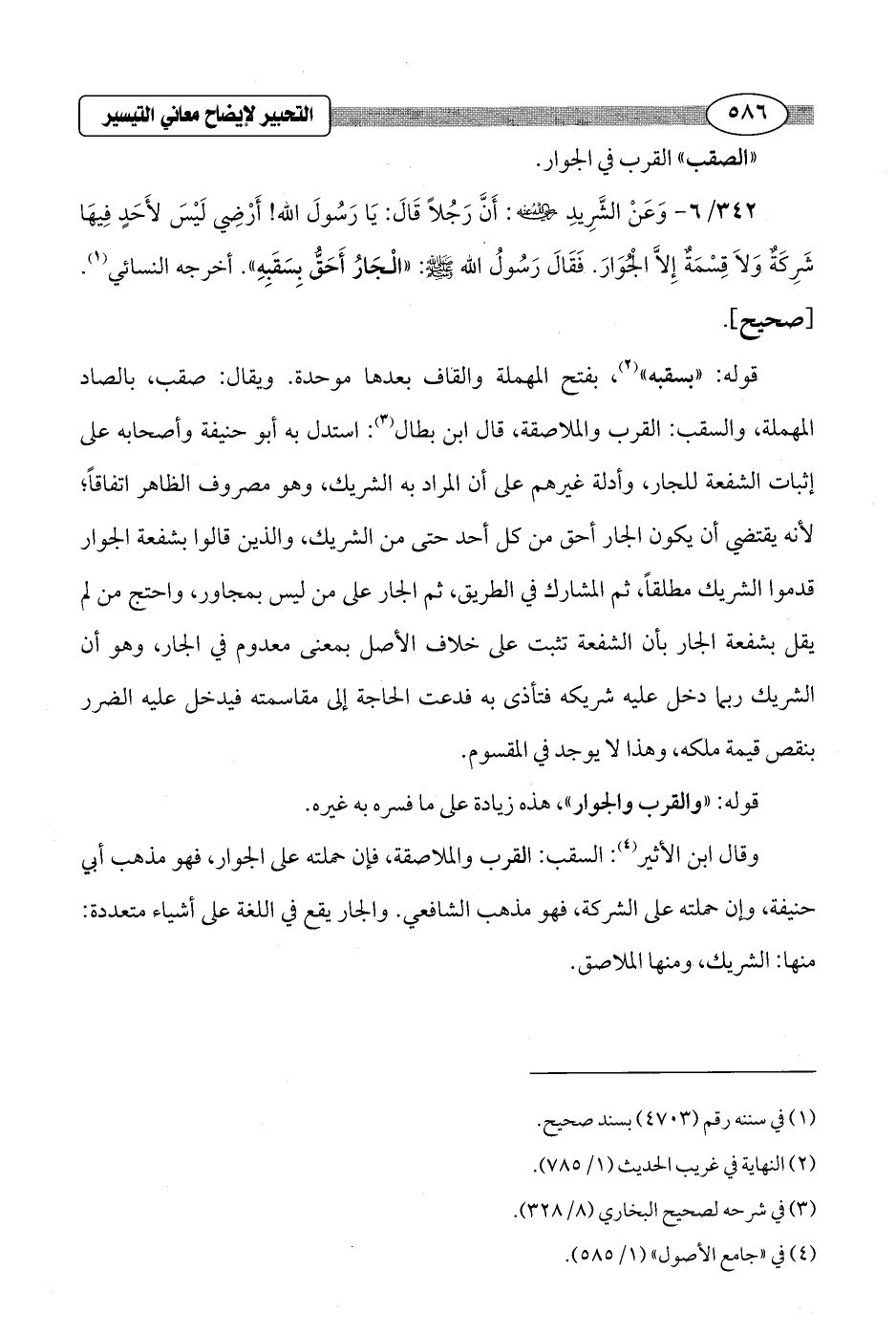 342/ 6 - وَعَنْ الشَّرِيدِ - رضي الله عنه -: أَنَّ رَجُلاً قَالَ: يَا رَسُولَ الله! أَرْضِي لَيْسَ لأَحَدٍ فِيهَا شَرِكَةٌ وَلاَ قِسْمَةٌ إِلاَّ الْجُوَارَ. فَقَالَ رَسُولُ الله - صلى الله عليه وسلم -: "الْجَارُ أَحَقُّ بِسَقَبِهِ". أخرجه النسائي (¬1). [صحيح].